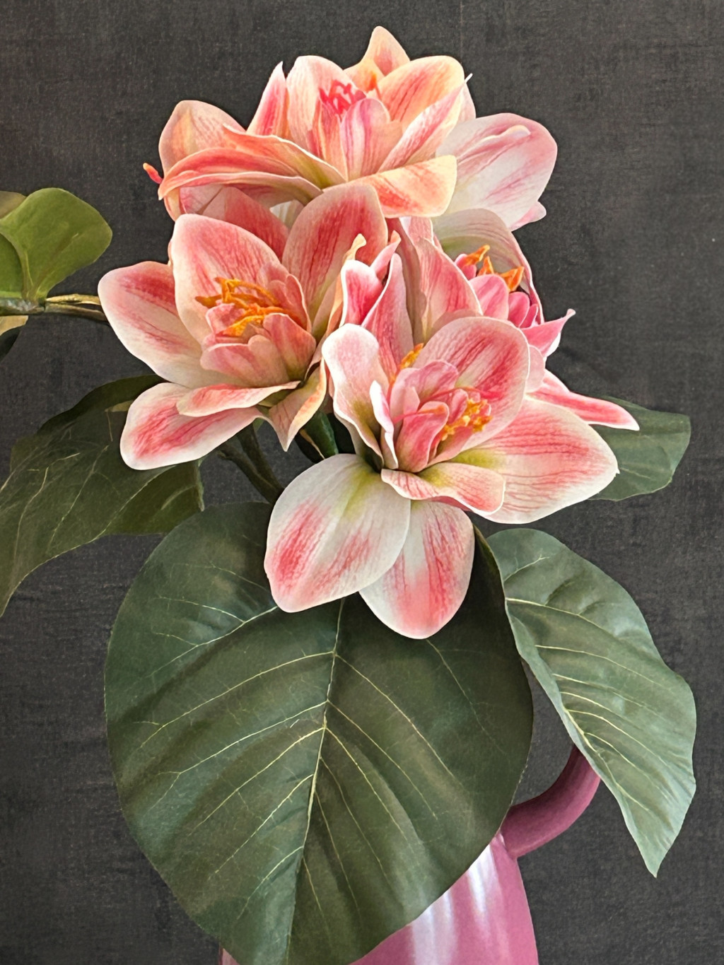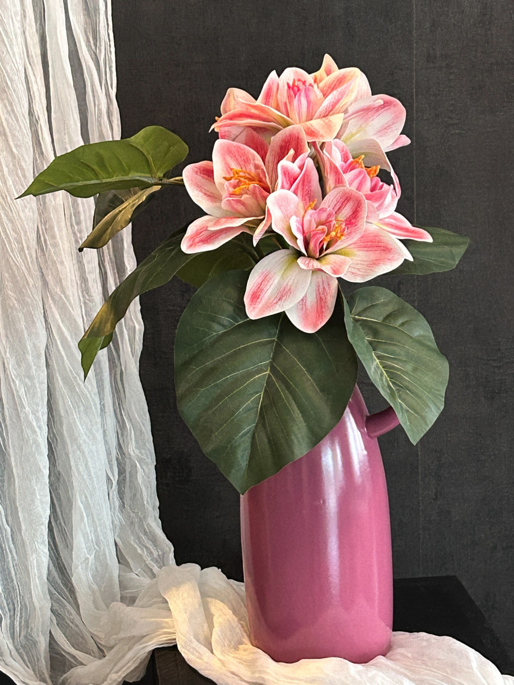 Ez a 31 cm magas, stílusos magenta színű 2 füles kancsó váza letisztult megjelenésével és a benne elhelyezett amarilis selyemvirágokkal tökéletes választás, ha időtálló, mégis természetközeli dekorációt szeretnél. A selyemvirágok élethű kidolgozása minden enteriőrt különlegessé tesz – évszaktól függetlenül is