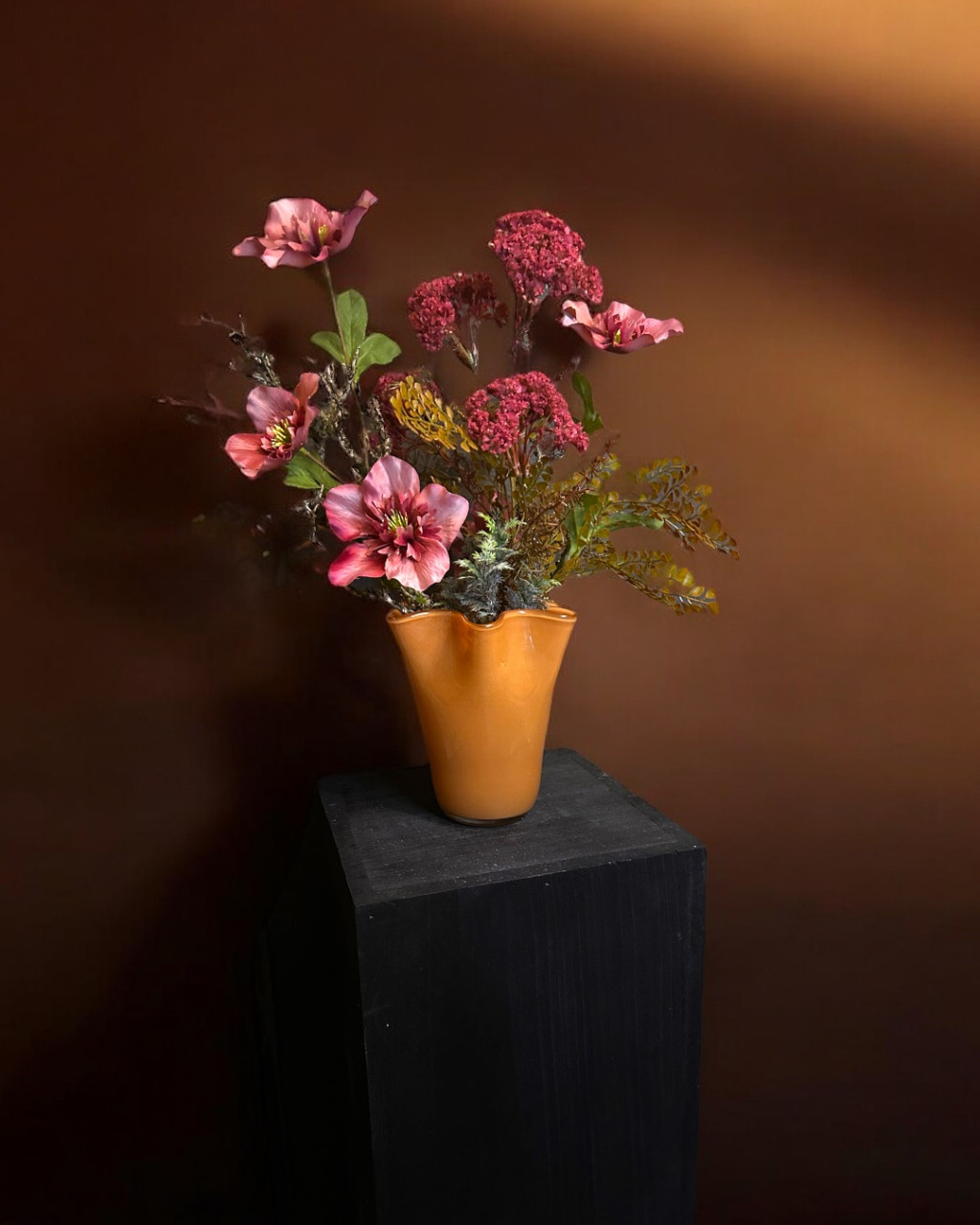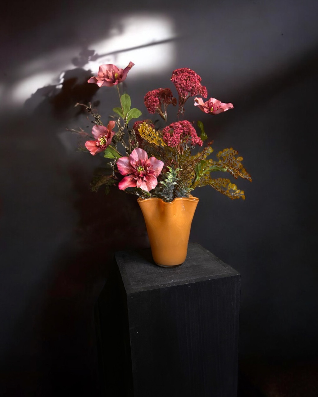 Ez a 25 cm magas, stílusos üveg váza letisztult megjelenésével és a benne elhelyezett helleborus selyemvirágokkal tökéletes választás, ha időtálló, mégis természetközeli dekorációt szeretnél. A selyemvirágok élethű kidolgozása minden enteriőrt különlegessé tesz – évszaktól függetlenül is