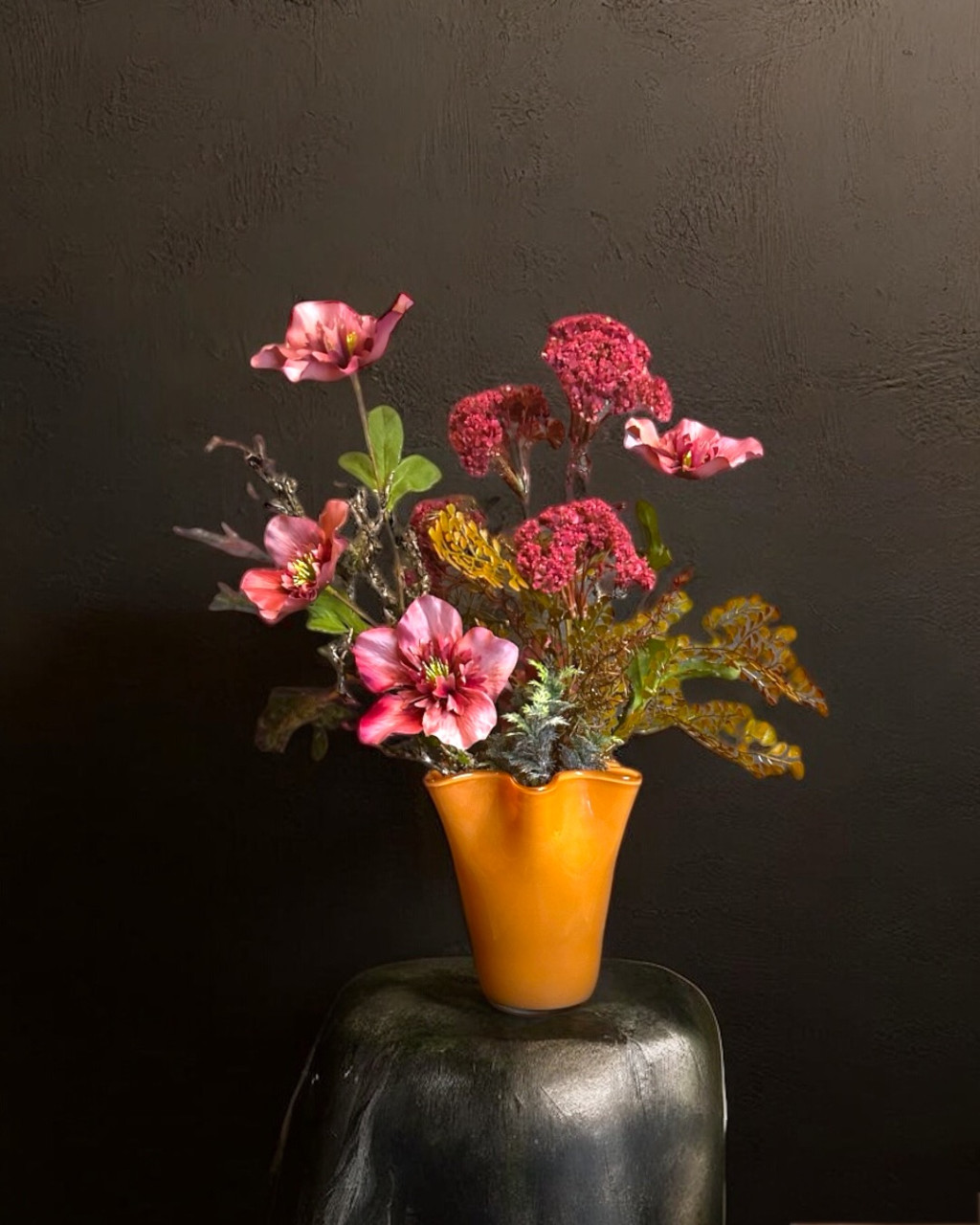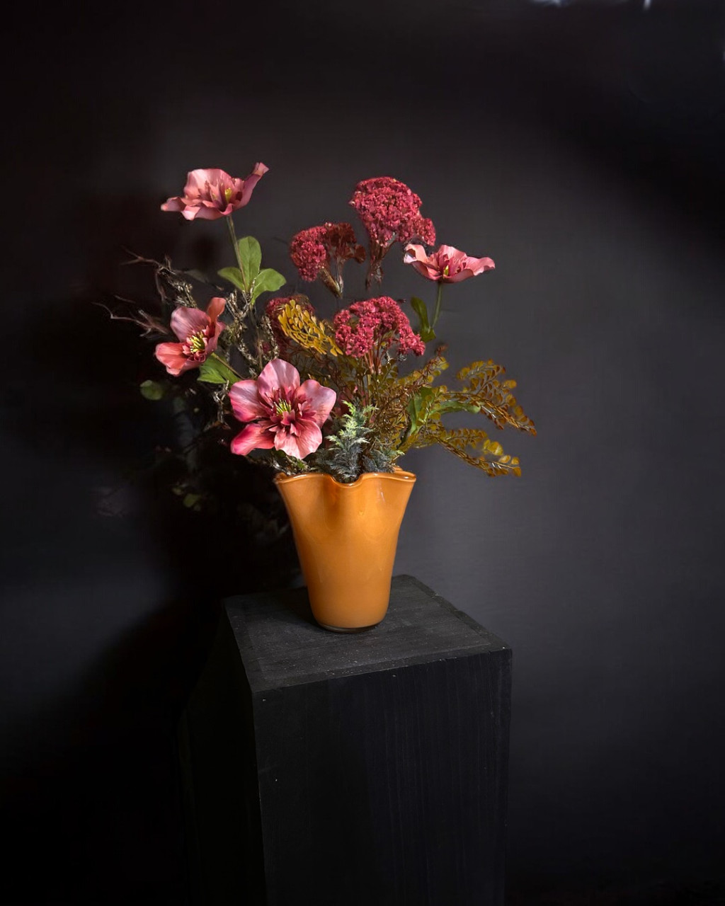 Exkluzív burgundy hunyor virágkompozíció hullámos vázában.