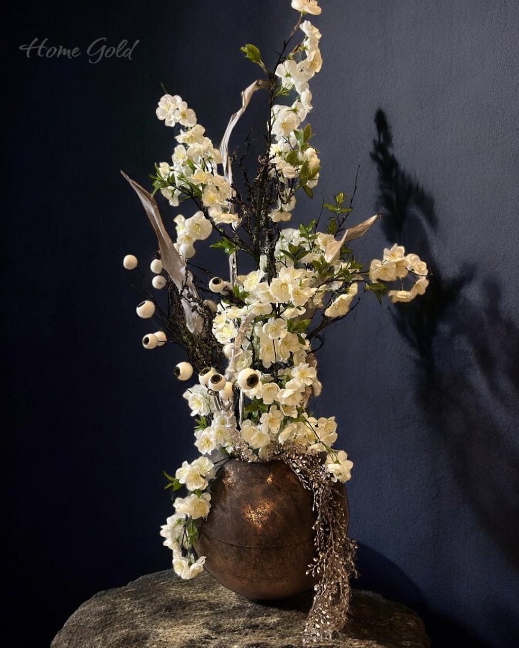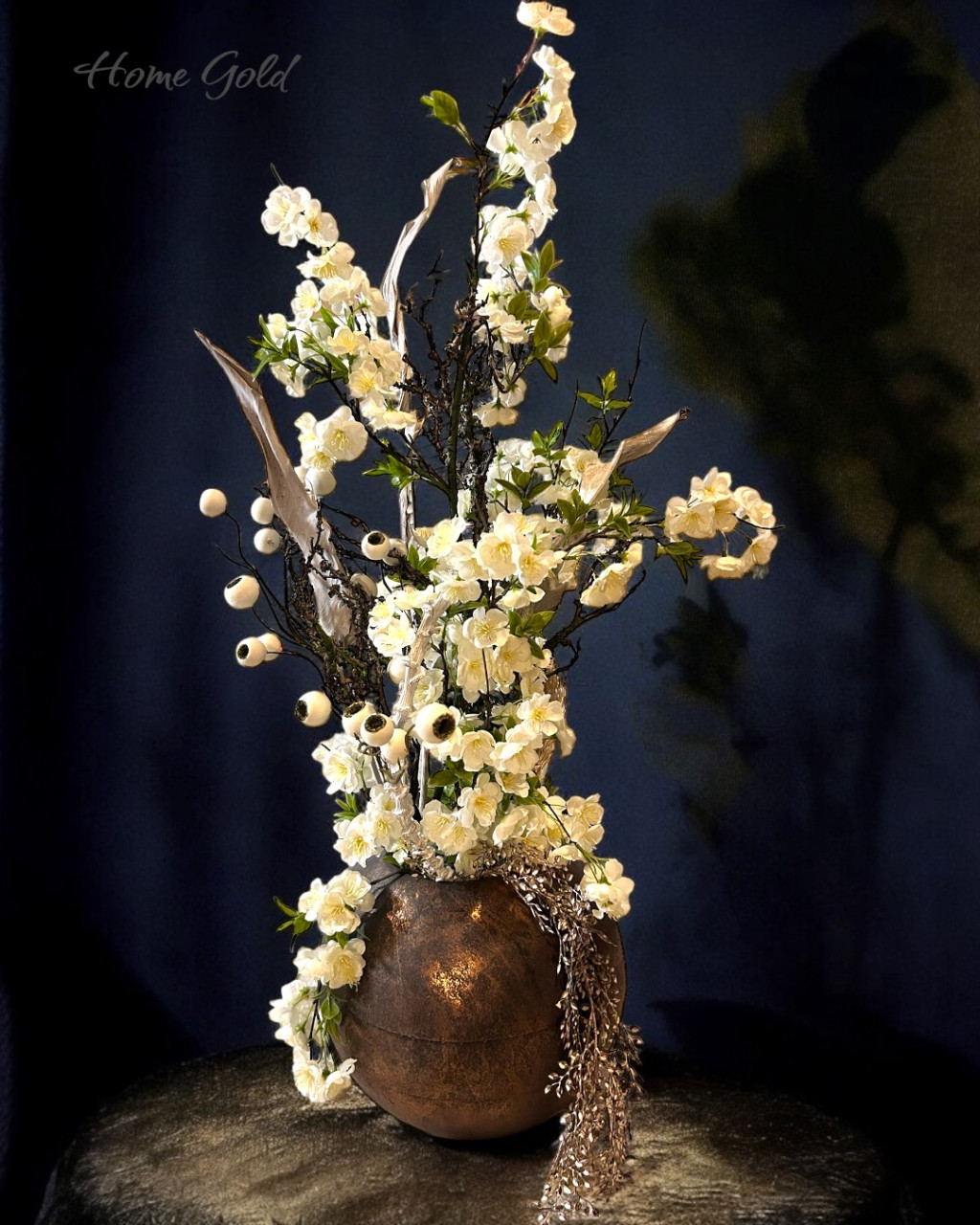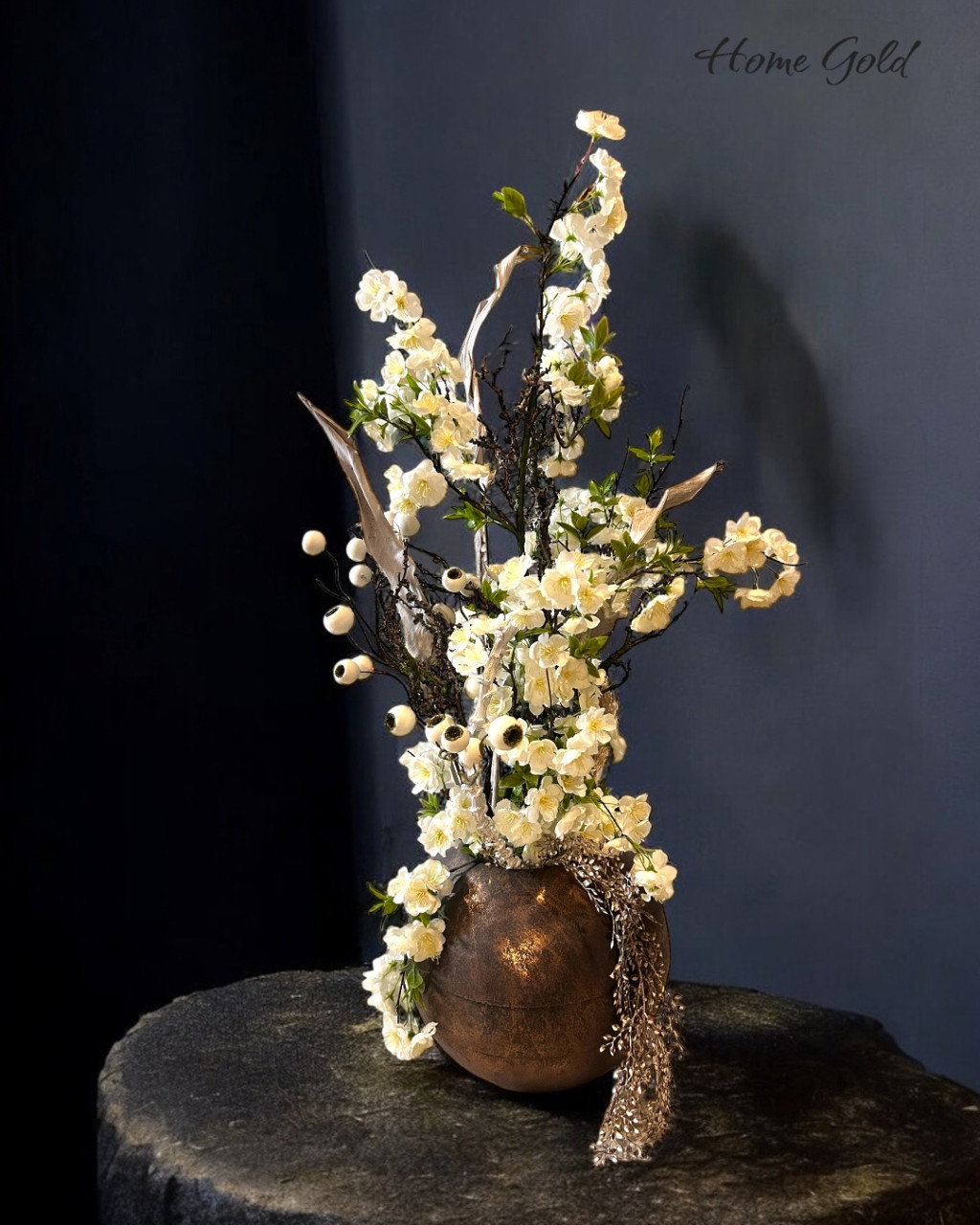 Exkluzív élethű selyem selyem cseresznyevirág fa kompozíció bronz bádog gömb kaspóban