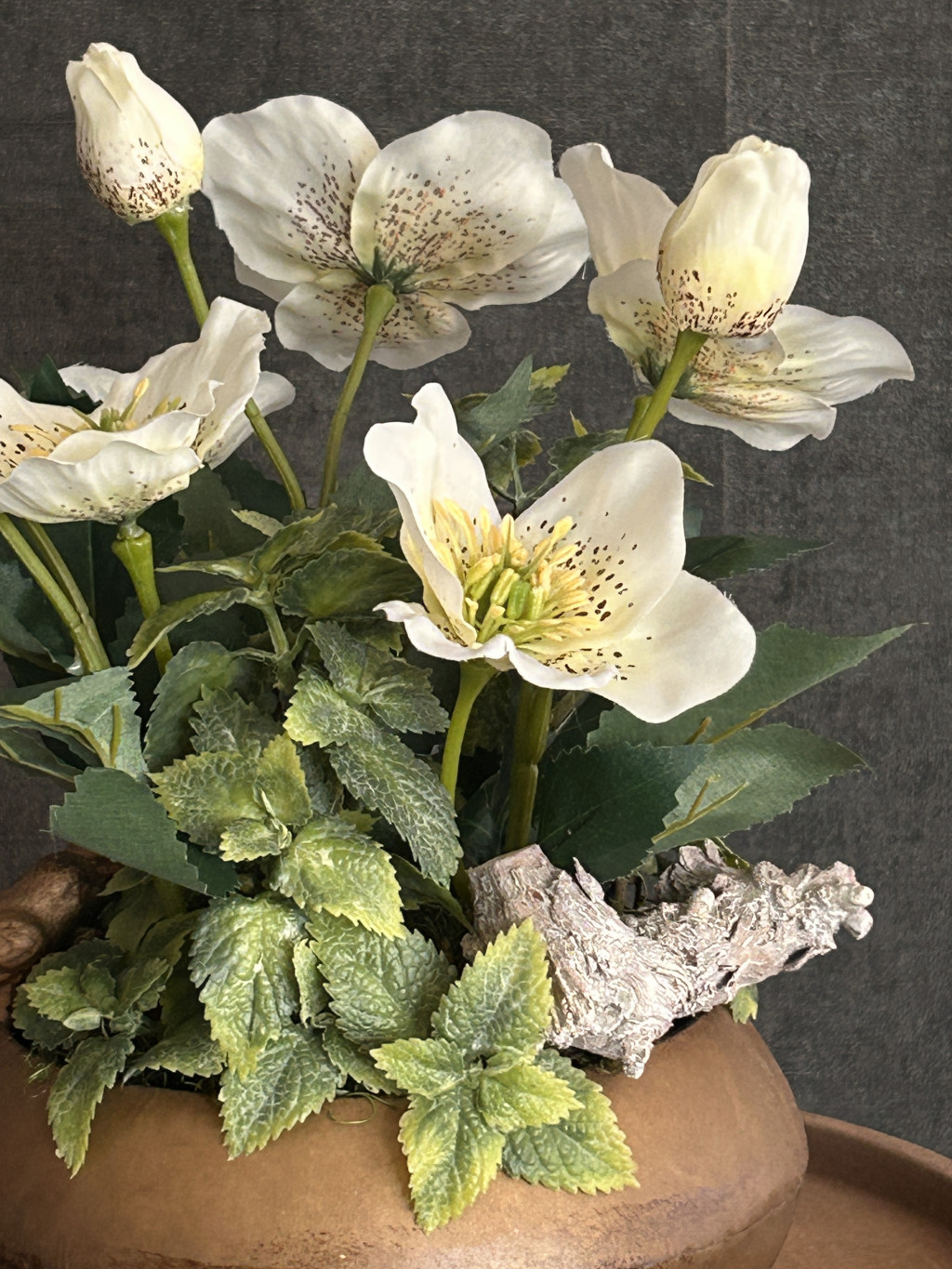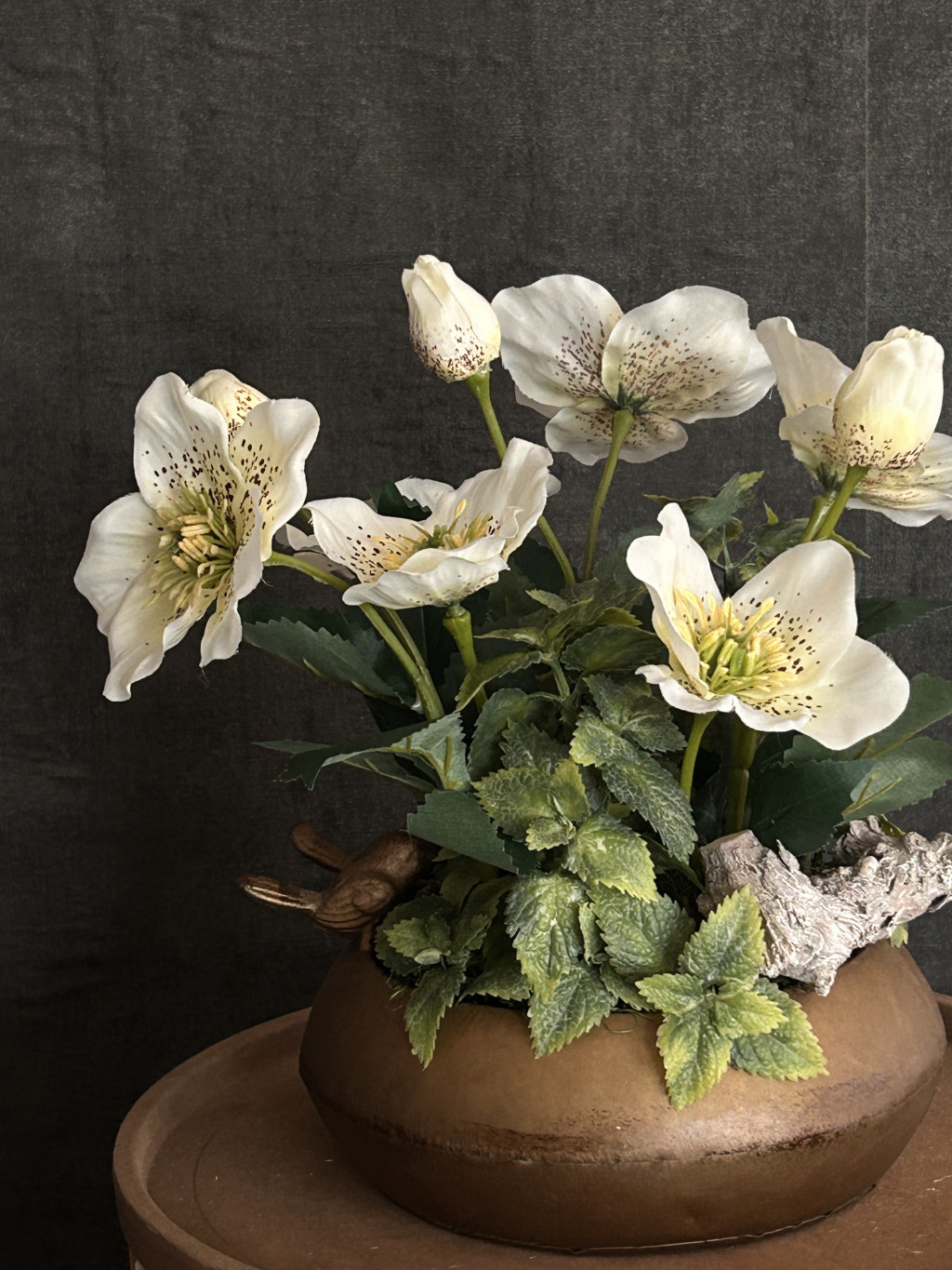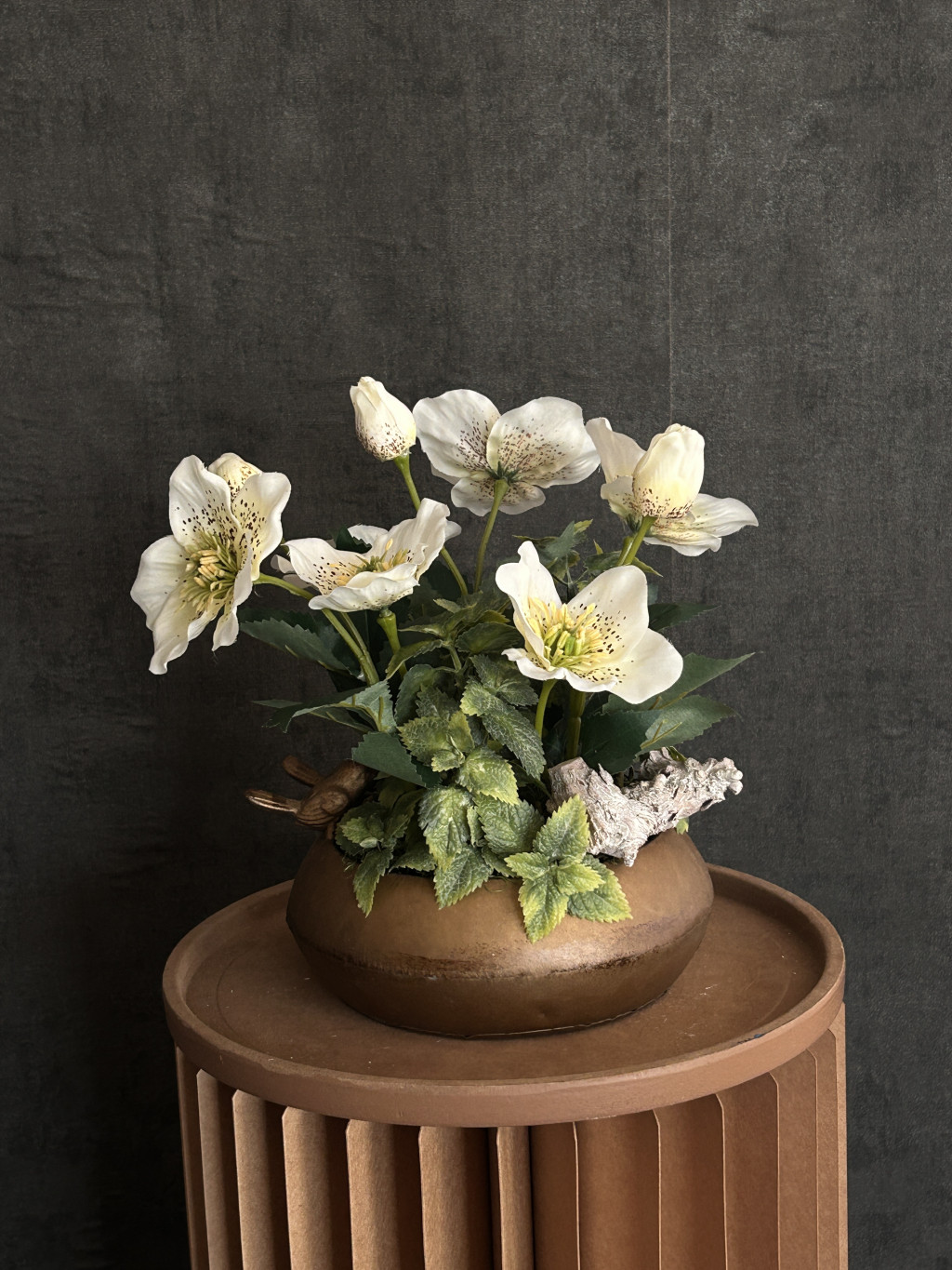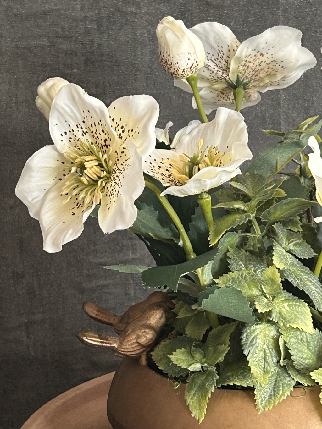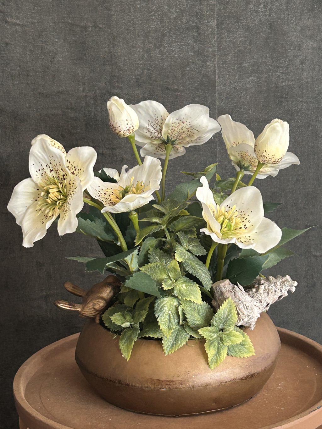 Exkluzív bronz fém madárkás tálon fehér hunyor selyemvirág kompozíció citromfűvel.