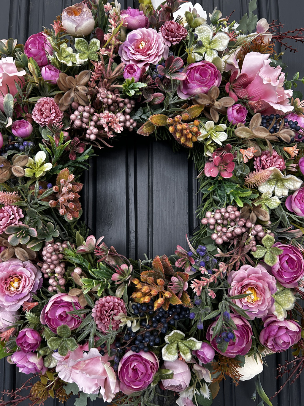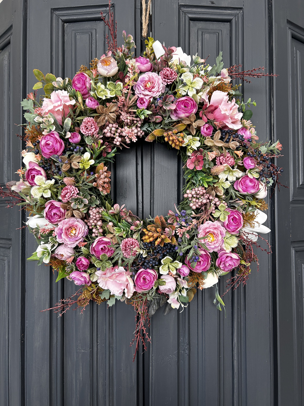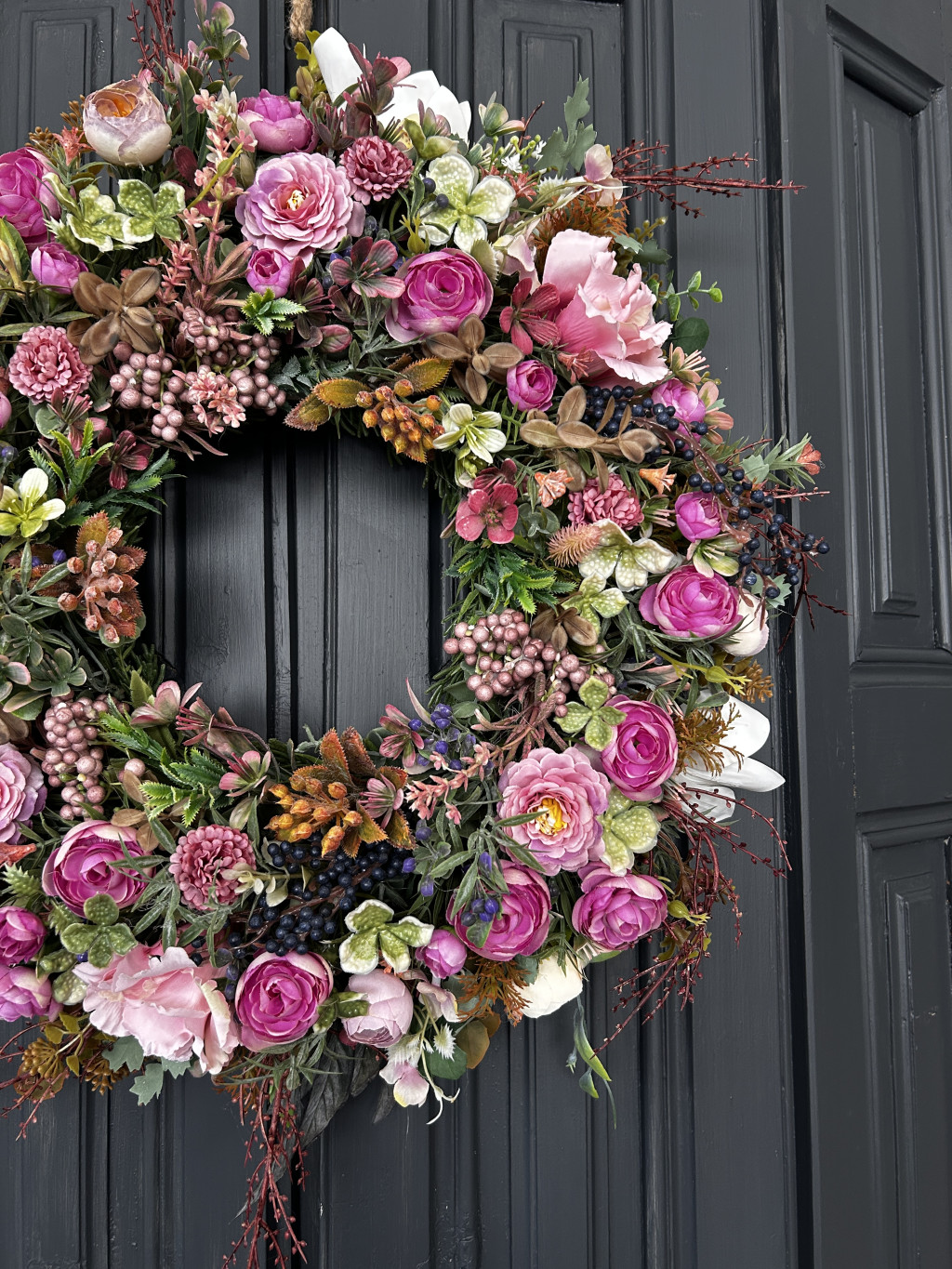 Fehér orchideákkal, pasztell rózsaszín liziantuszokkal,apró virágokkal készült ajtókopogtató.
