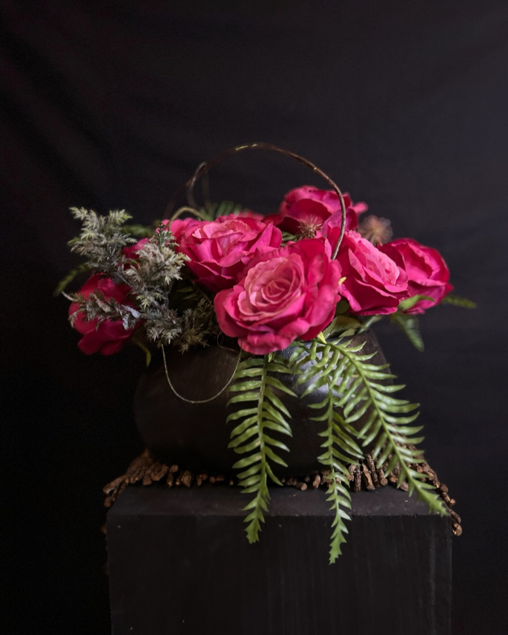 Exkluzív hatalmas rózsák virágkompozíció zöldekkel egy fekete bádog tálban.