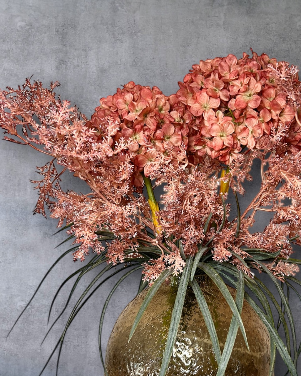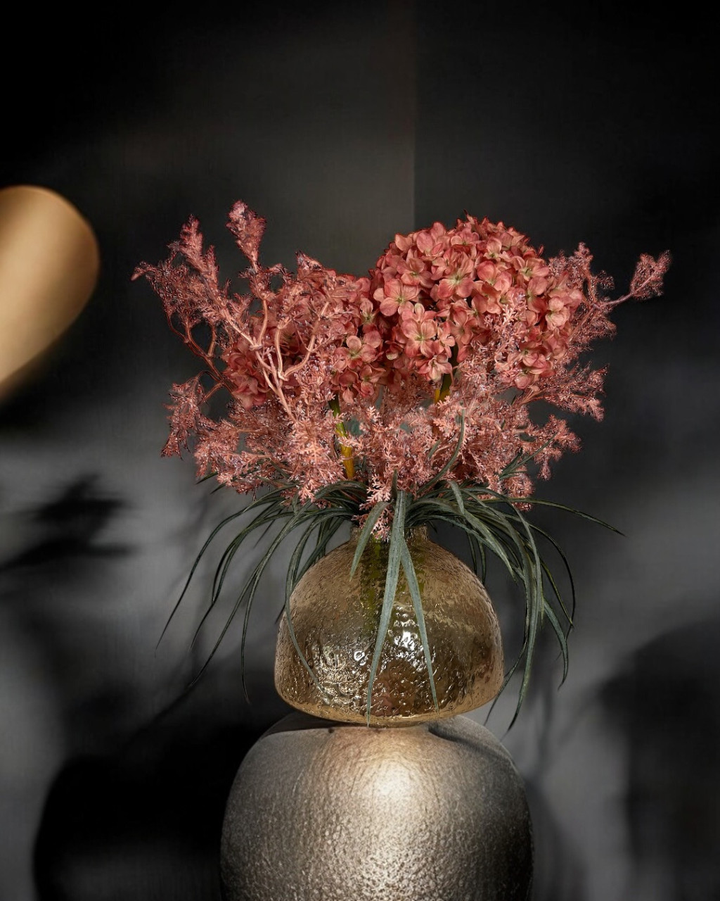 Ez a 22 cm magas, stílusos üveg fekete áttetsző váza letisztult megjelenésével és a benne elhelyezett hiperrealisztikus hortenzia selyemvirágokkal tökéletes választás, ha időtálló, mégis természetközeli dekorációt szeretnél. A selyemvirágok élethű kidolgozása minden enteriőrt különlegessé tesz – évszaktól függetlenül is