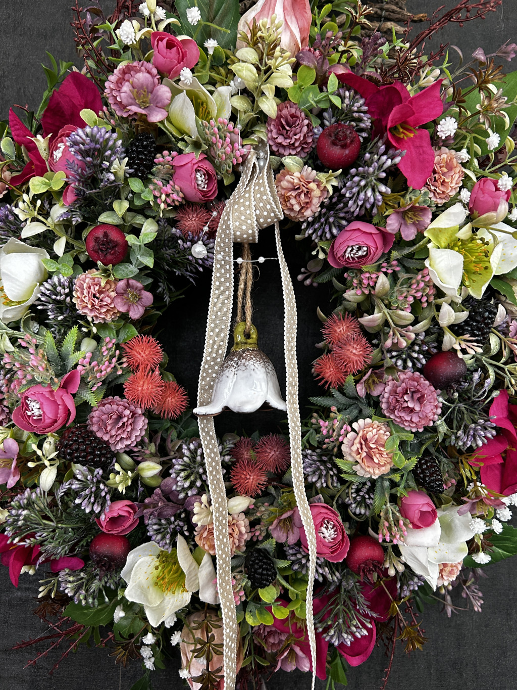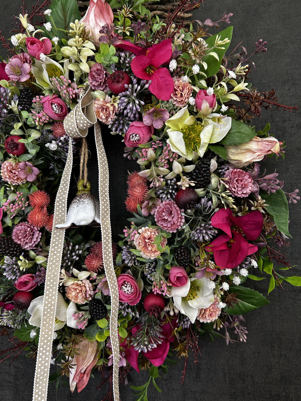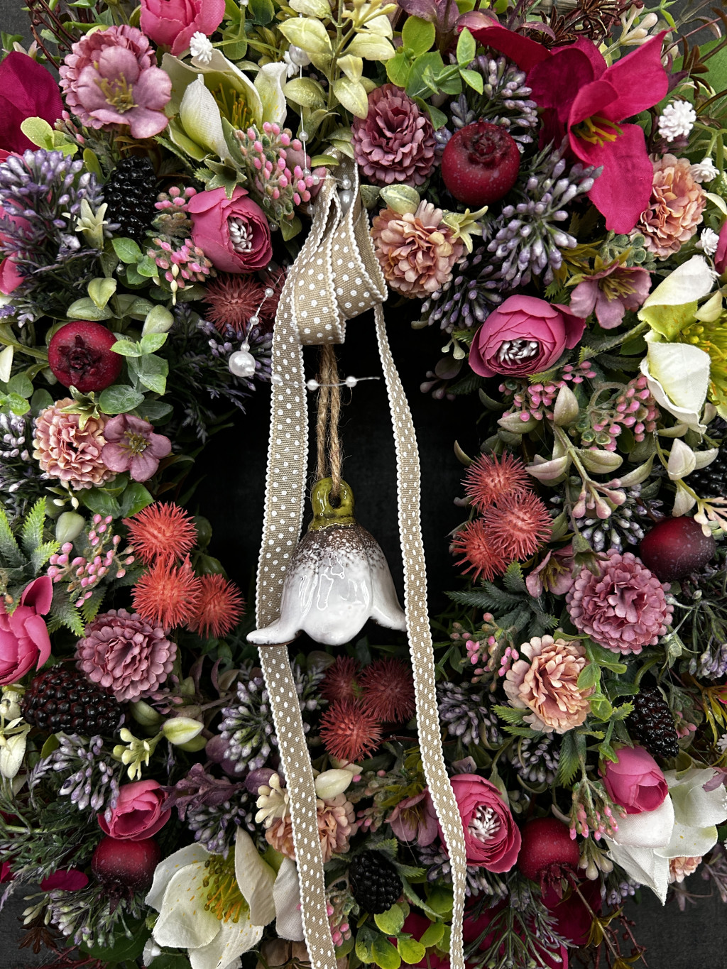Exkluzív kerámia függővel, fehér hunyorral, murvafürttel, szederrel, boglárkákkal,apró virágokkal készült ajtókopogtató.