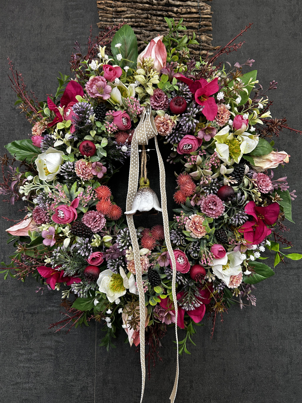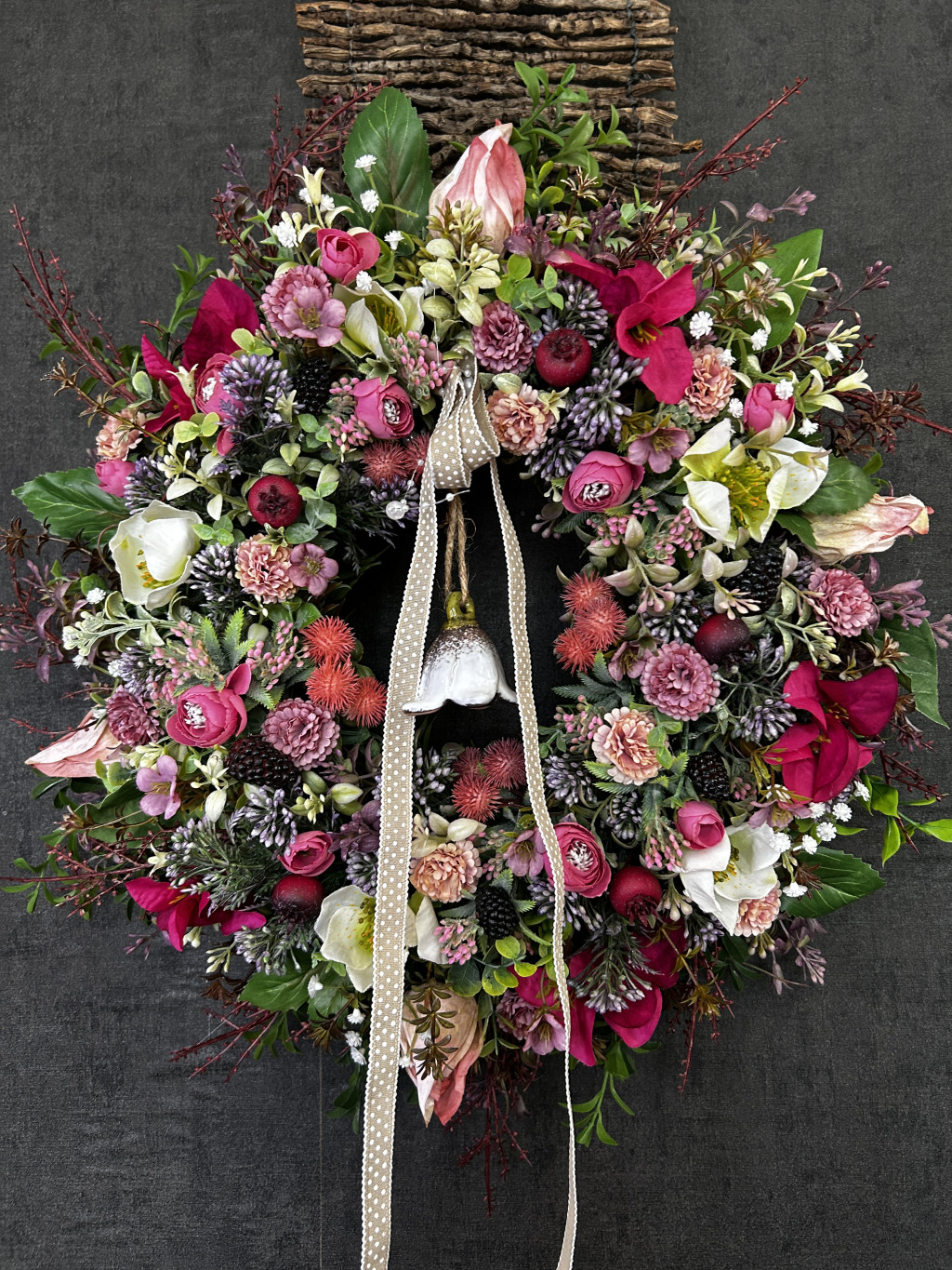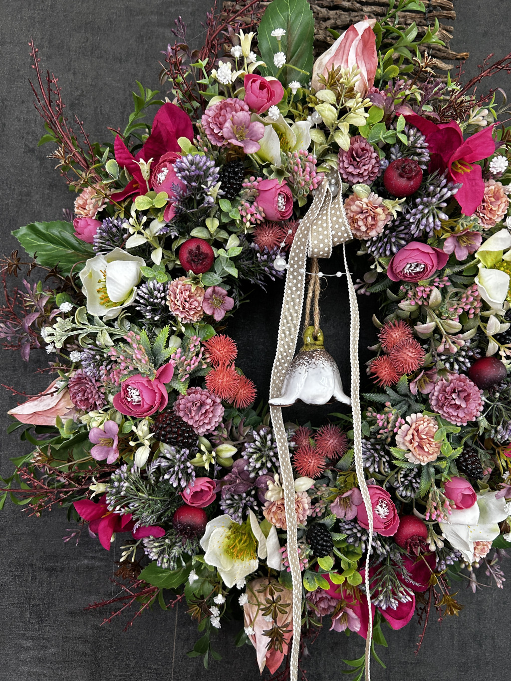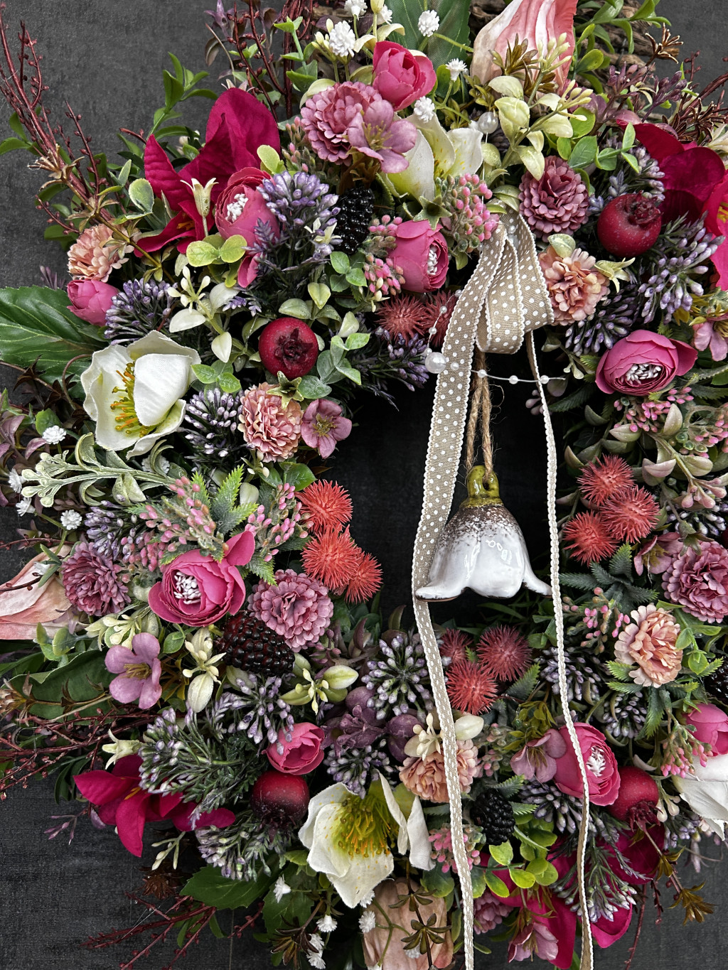 Exkluzív kerámia függővel, fehér hunyorral, murvafürttel, szederrel, boglárkákkal,apró virágokkal készült ajtókopogtató.