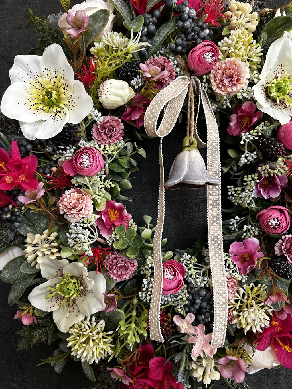 Exkluzív kerámia függővel, fehér hunyorral, murvafürttel, szederrel, boglárkákkal,apró virágokkal készült ajtókopogtató.