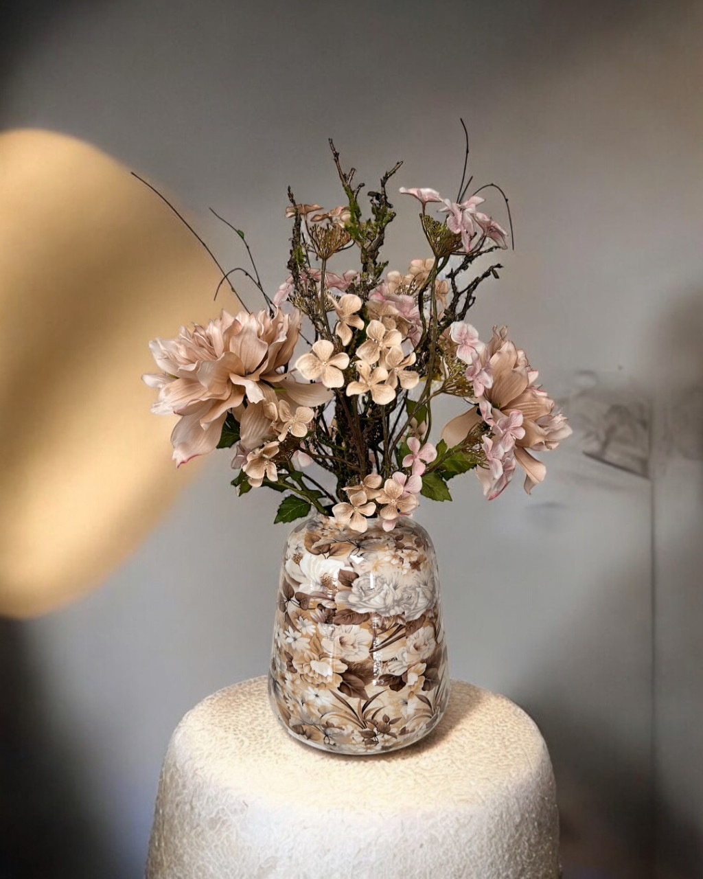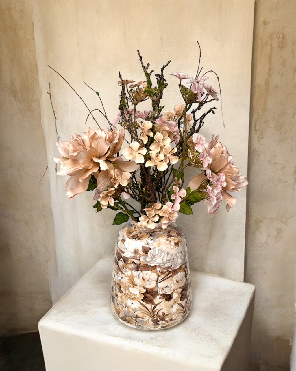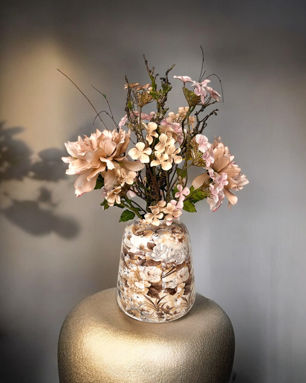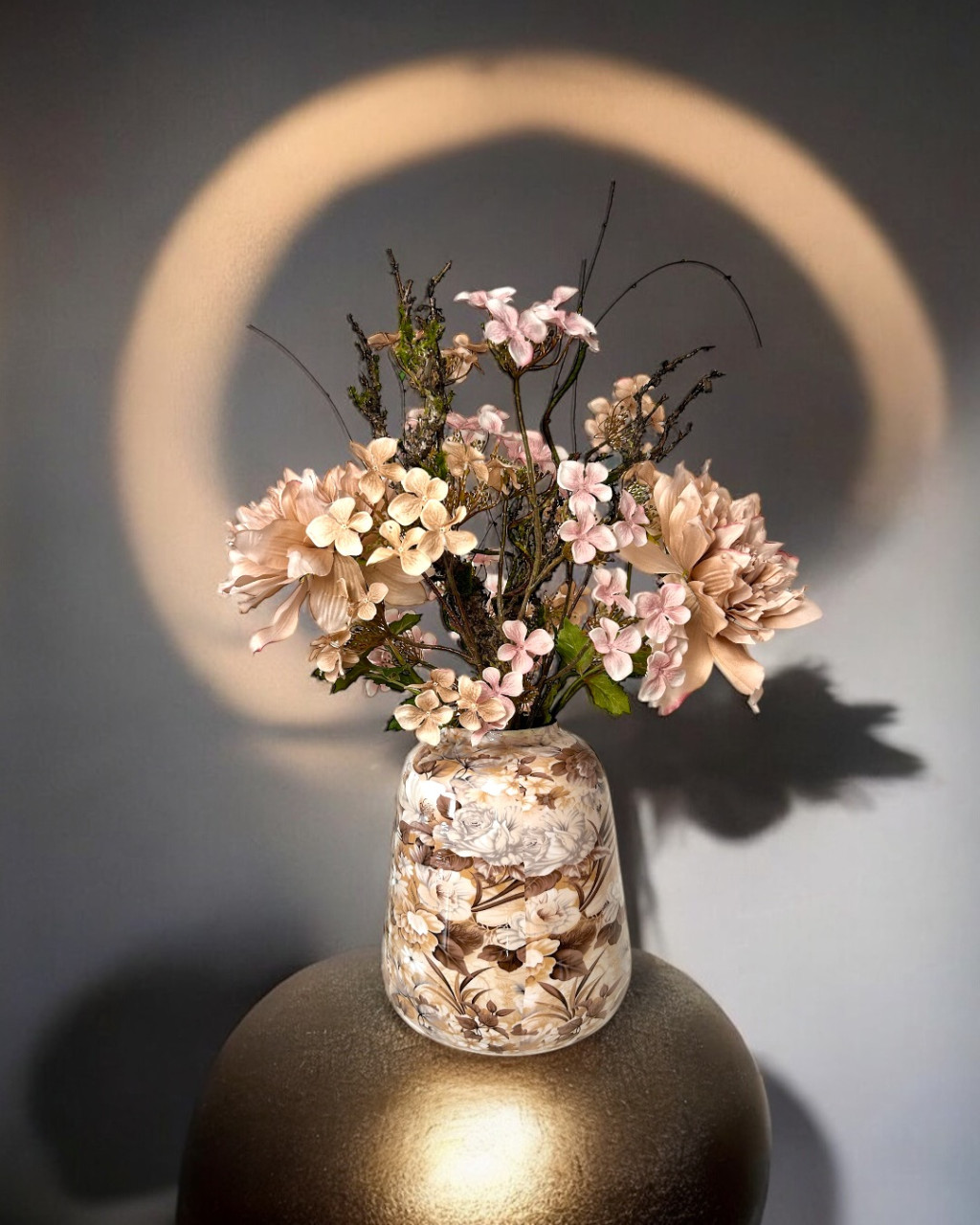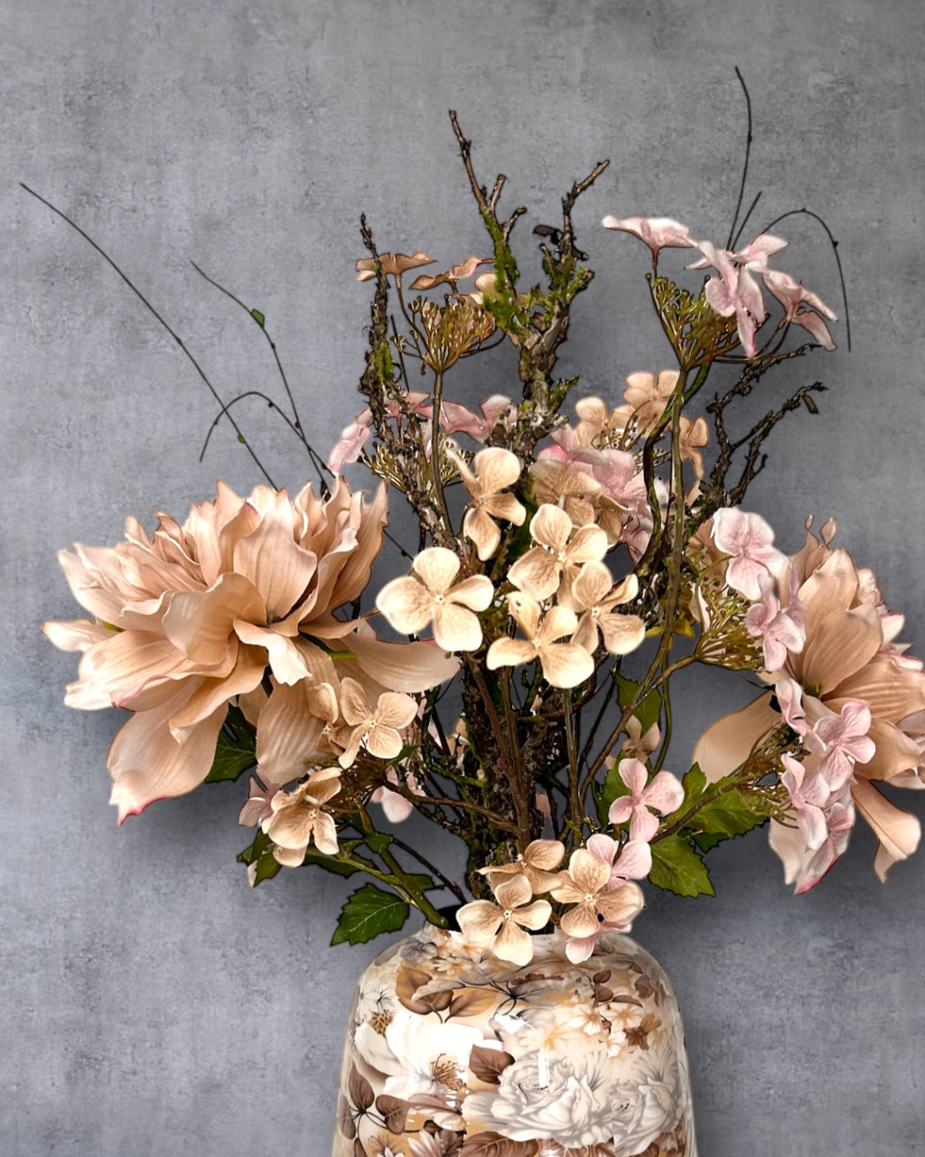 Ez a 25cm magas, stílusos fényes virág mintás fém váza letisztult megjelenésével és a benne elhelyezett hiperrealisztikus hortenzia és dália selyemvirágokkal tökéletes választás, ha időtálló, mégis természetközeli dekorációt szeretnél. A selyemvirágok élethű kidolgozása minden enteriőrt különlegessé tesz – évszaktól függetlenül is