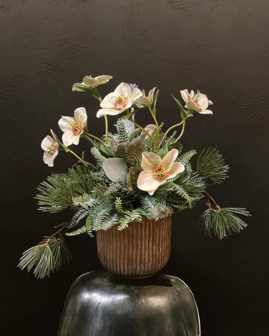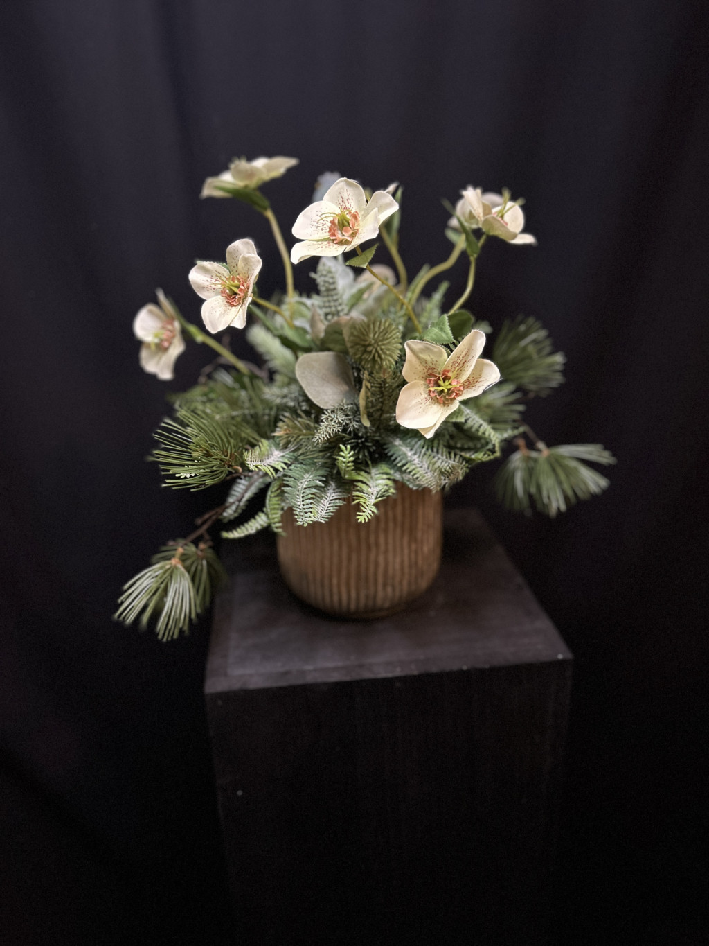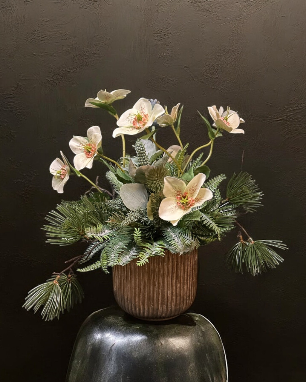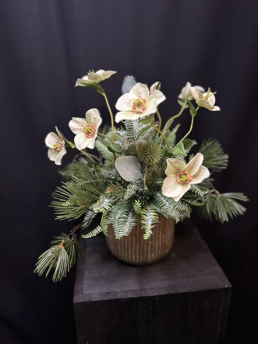 Exkluzív arany zsinóros kaspóban krém hunyor,hamvas zöldek, fenyőágakkal készült kompozíció