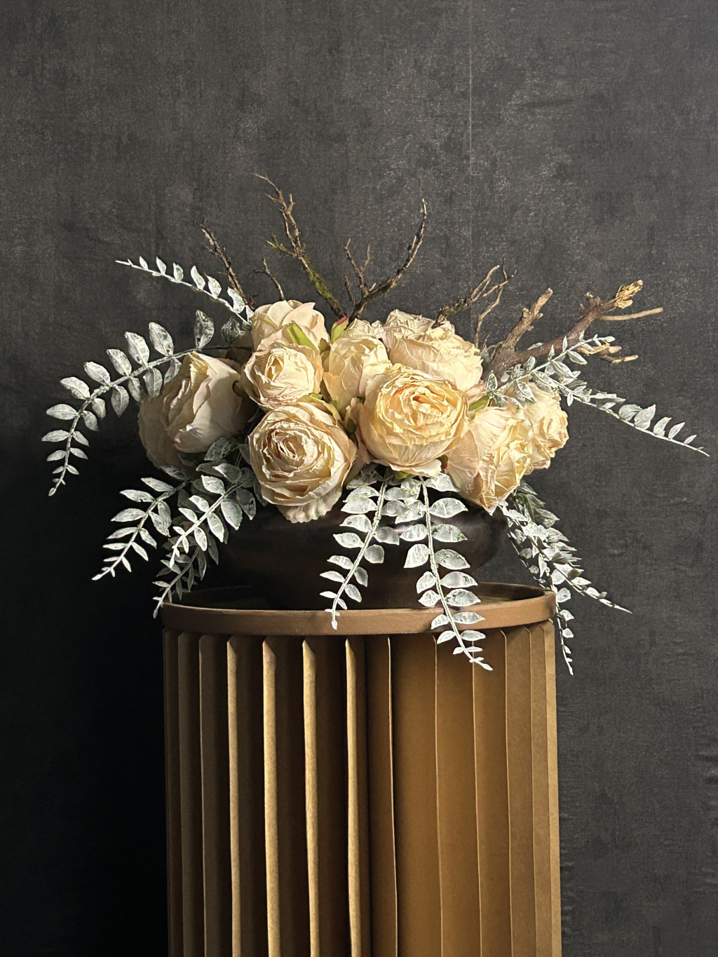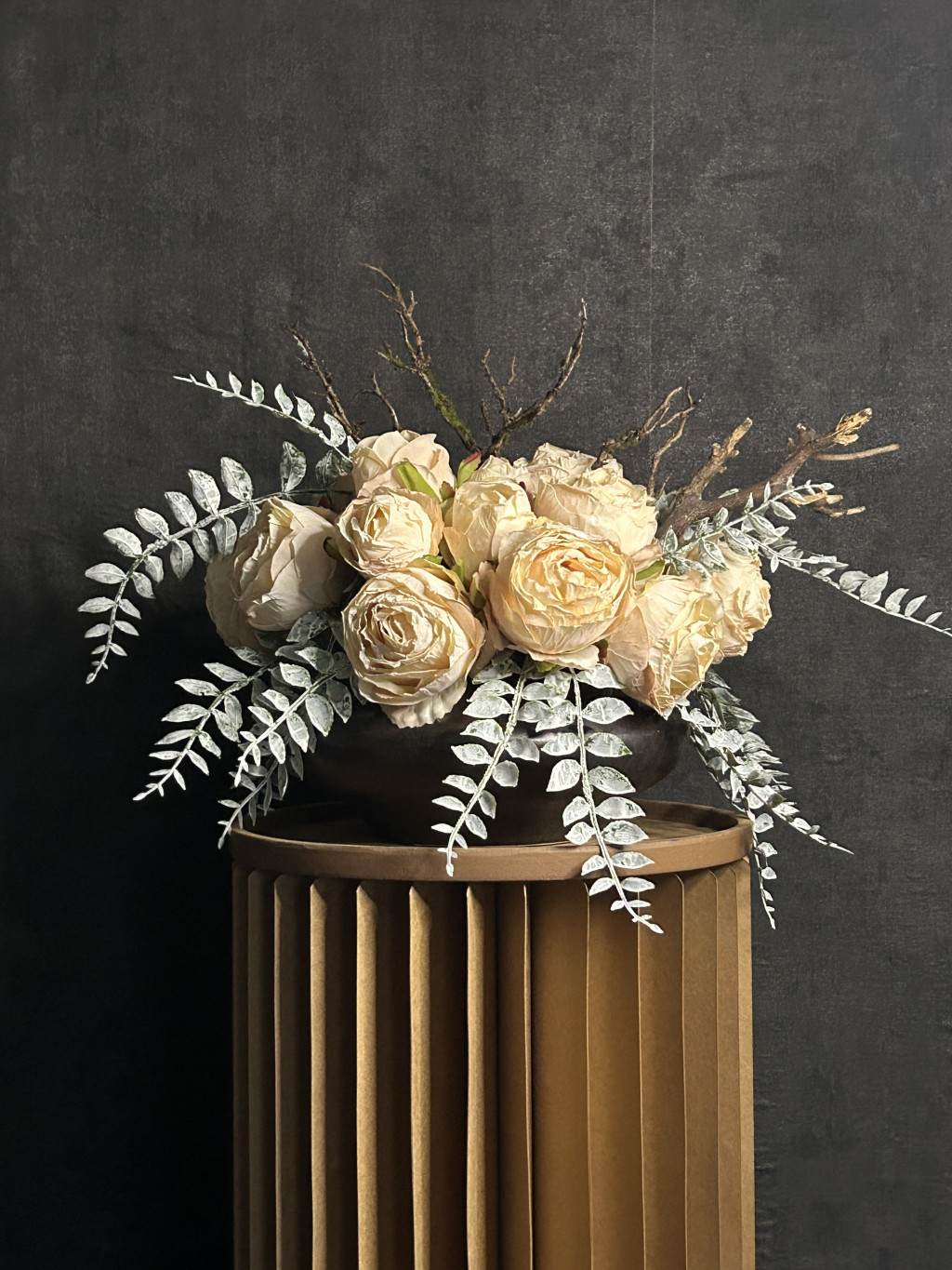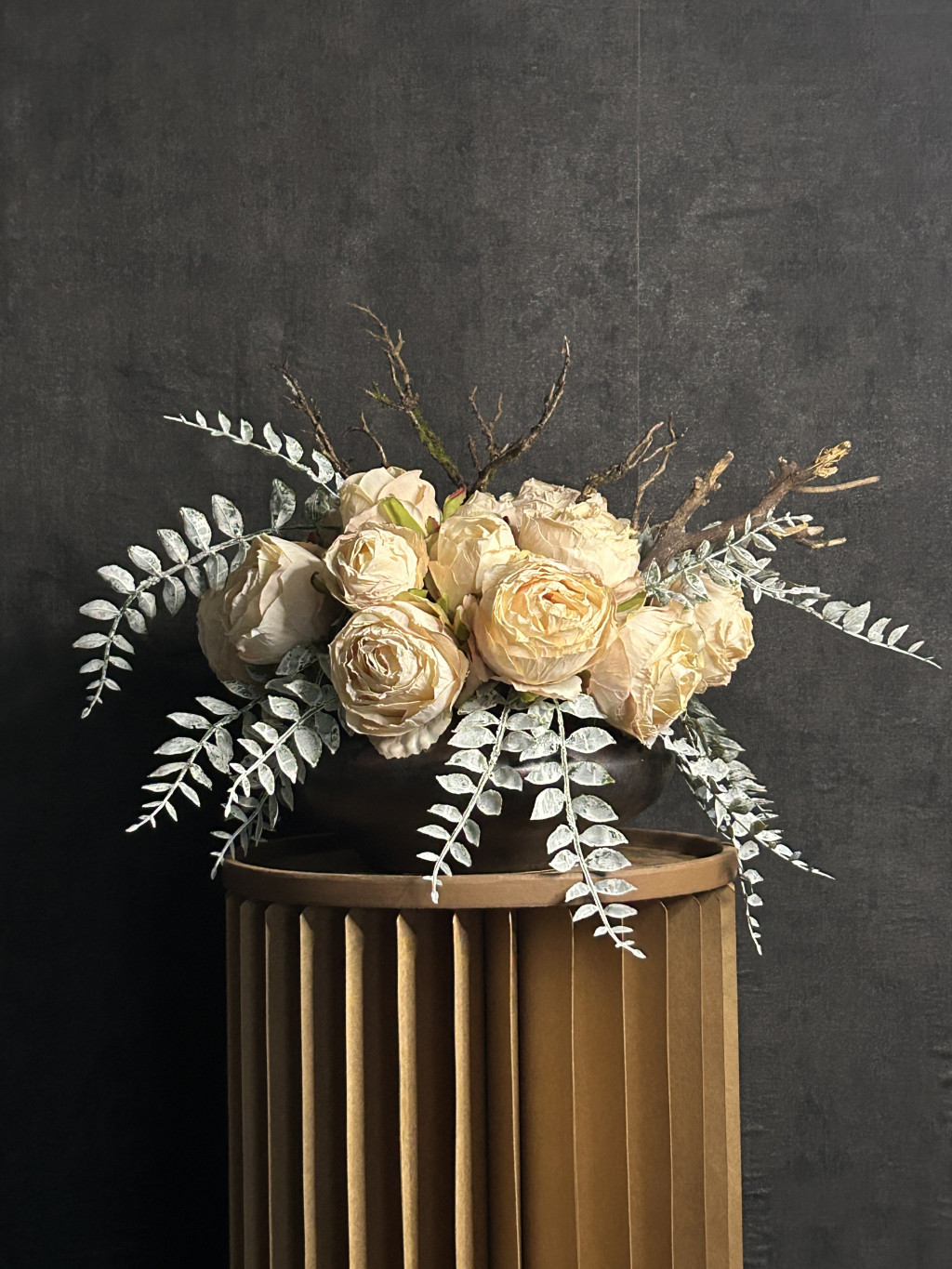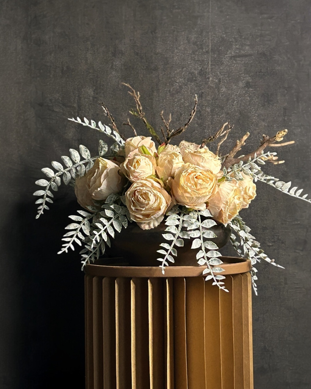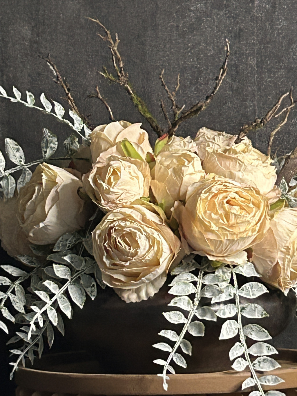 Exkluzív krém szárított hatású rózsa virágkompozíció (17 szál nagy fejű rózsa )egy kerámia tálvázában