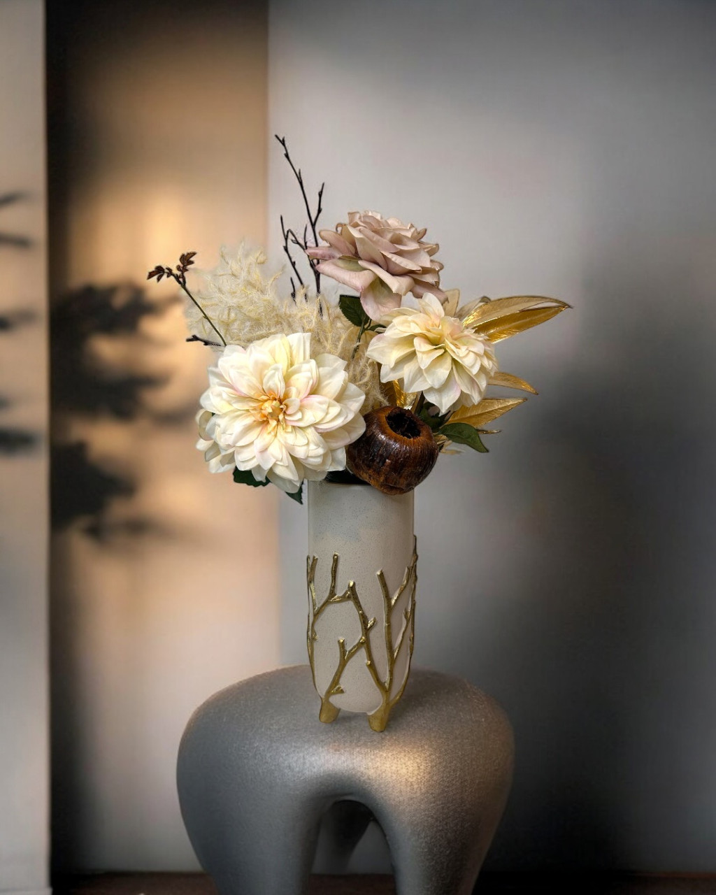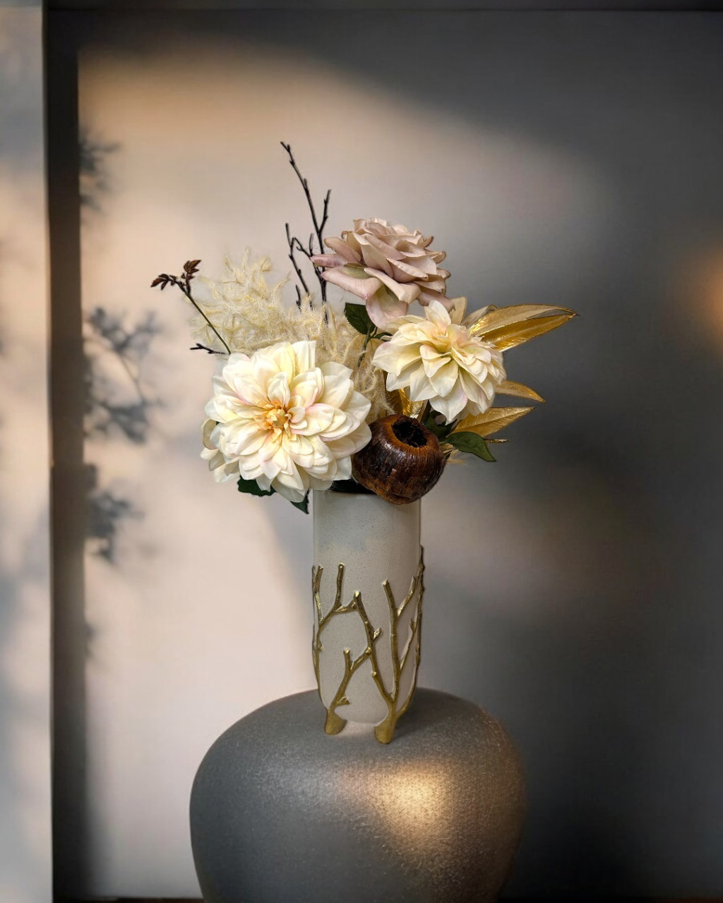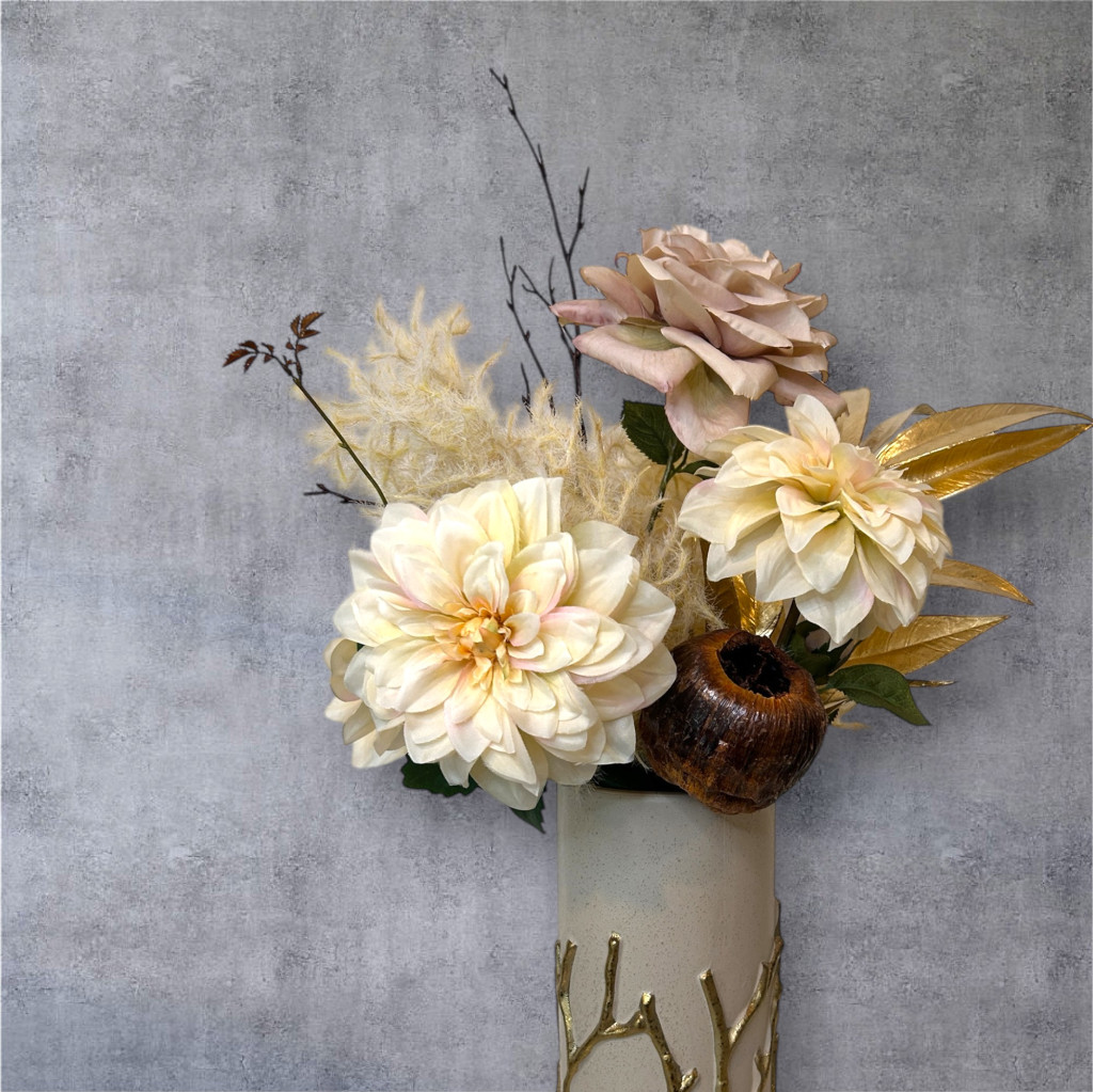 Exkluzív krém nagy fejű dália selyemvirágok,rózsák, arany eukaliptusszal arany ágas bézs kerámia vázában