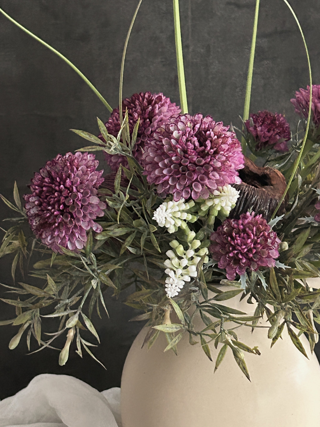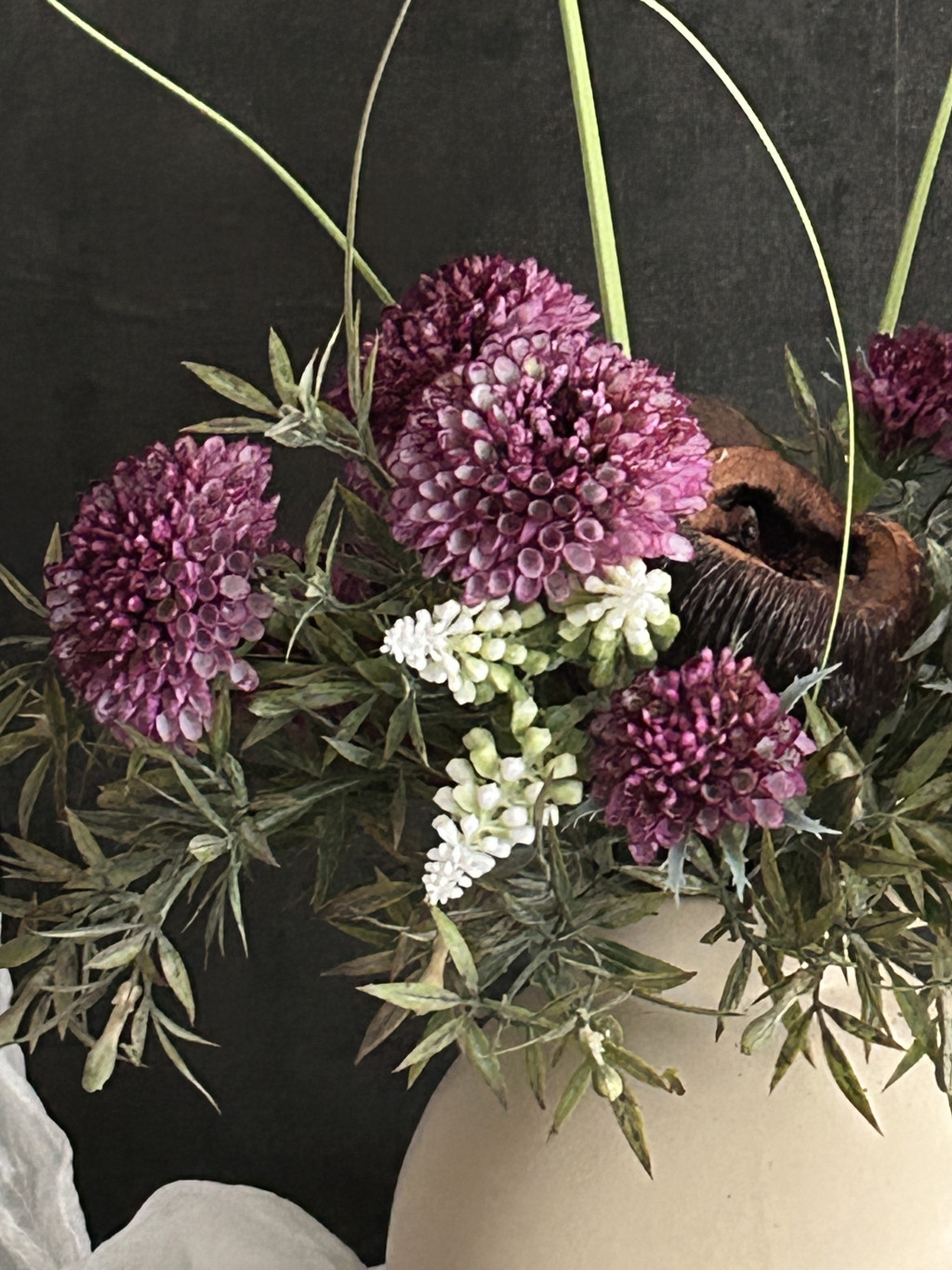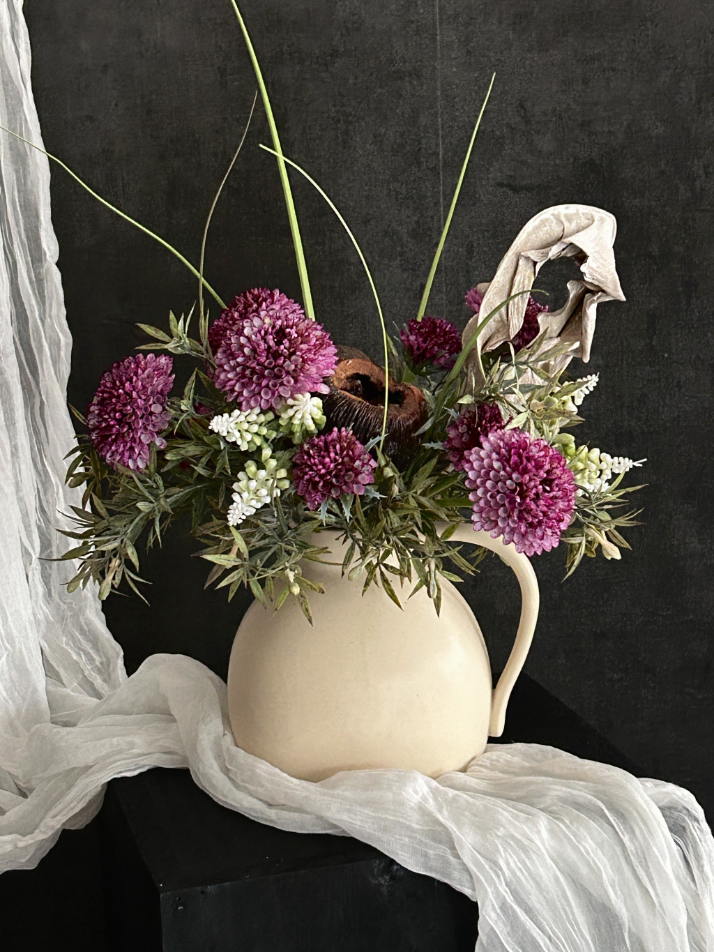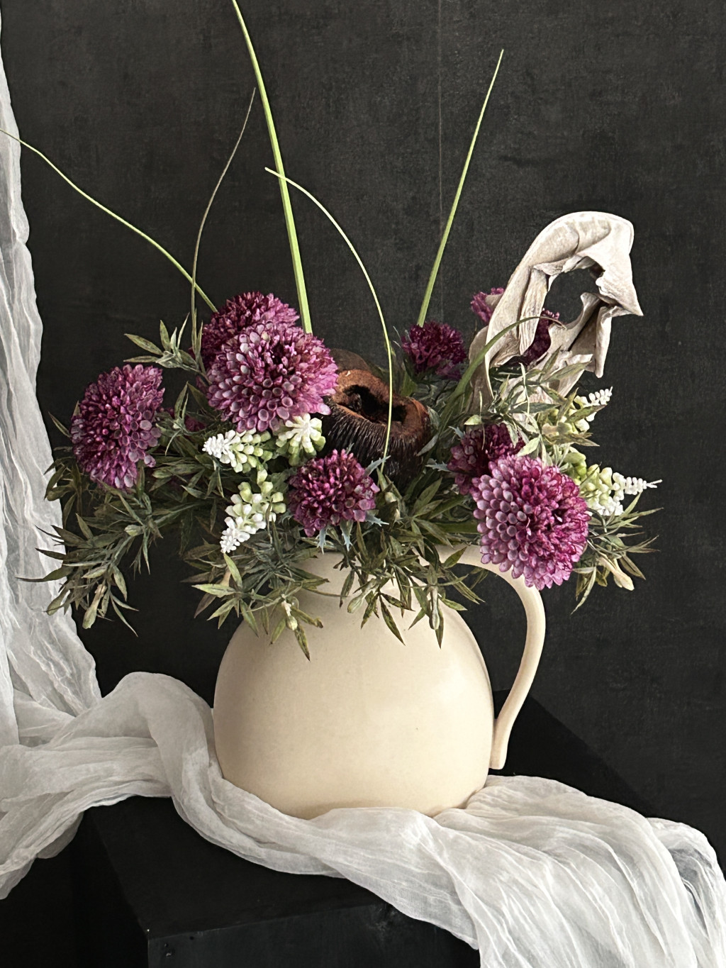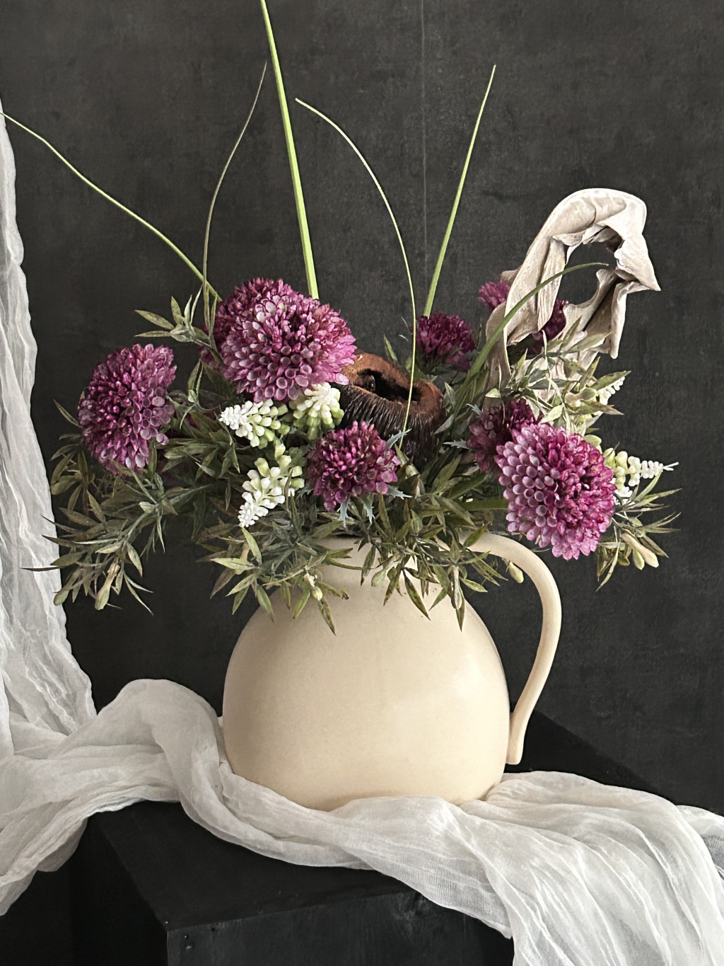Ez a 15 cm magas, stílusos krém kancsó váza letisztult megjelenésével és a benne elhelyezett realisztikus lila dália selyemvirágokkal,és termésekkel tökéletes választás, ha időtálló, mégis természetközeli dekorációt szeretnél. A selyemvirágok élethű kidolgozása minden enteriőrt különlegessé tesz – évszaktól függetlenül is