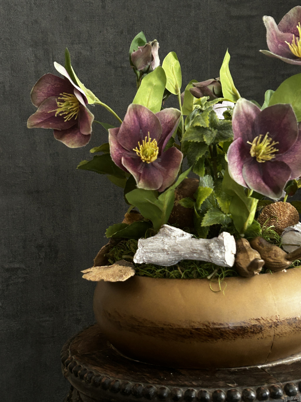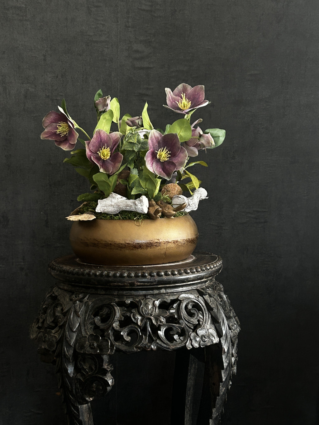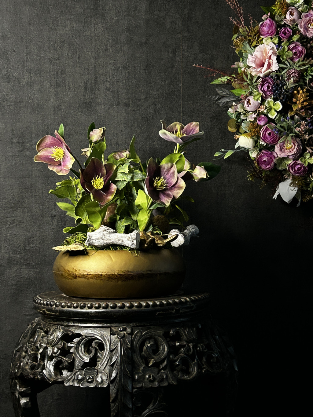 A kompozíciót gondosan válogatott, prémium minőségű helleborus virágok alkotják, melyek egy elegáns, arany árnyalatú antikolt fém tálon kapnak helyet.