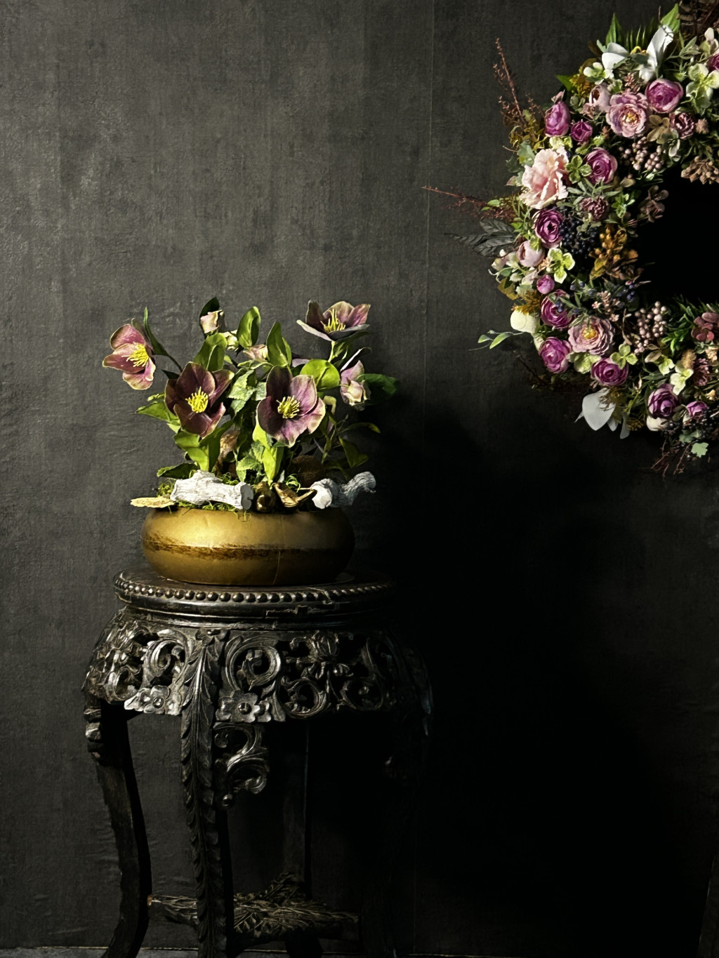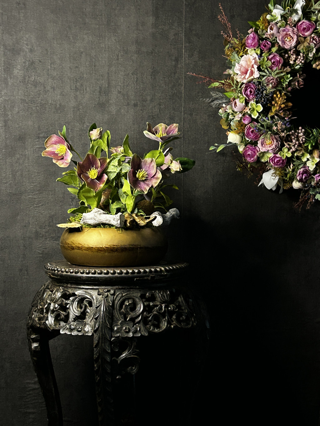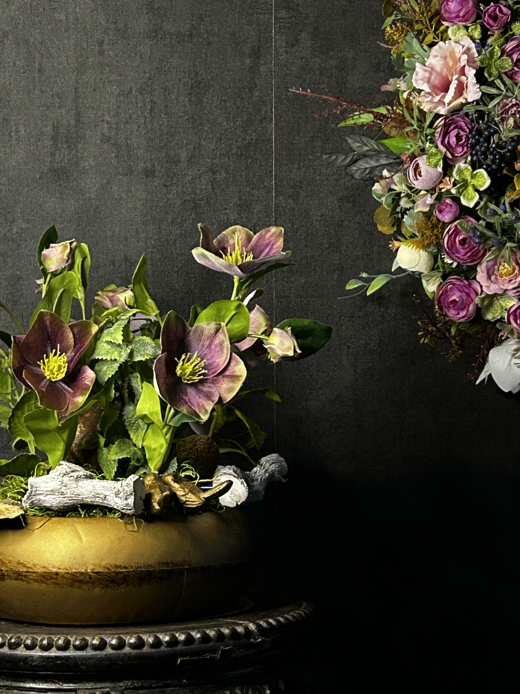 A kompozíciót gondosan válogatott, prémium minőségű helleborus virágok alkotják, melyek egy elegáns, arany árnyalatú antikolt fém tálon kapnak helyet.