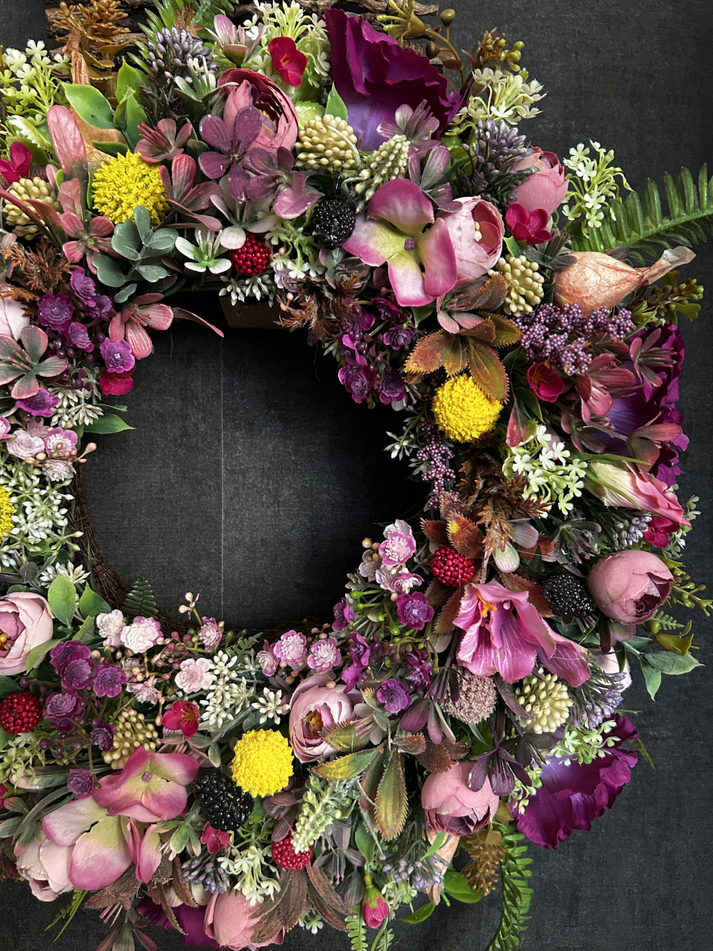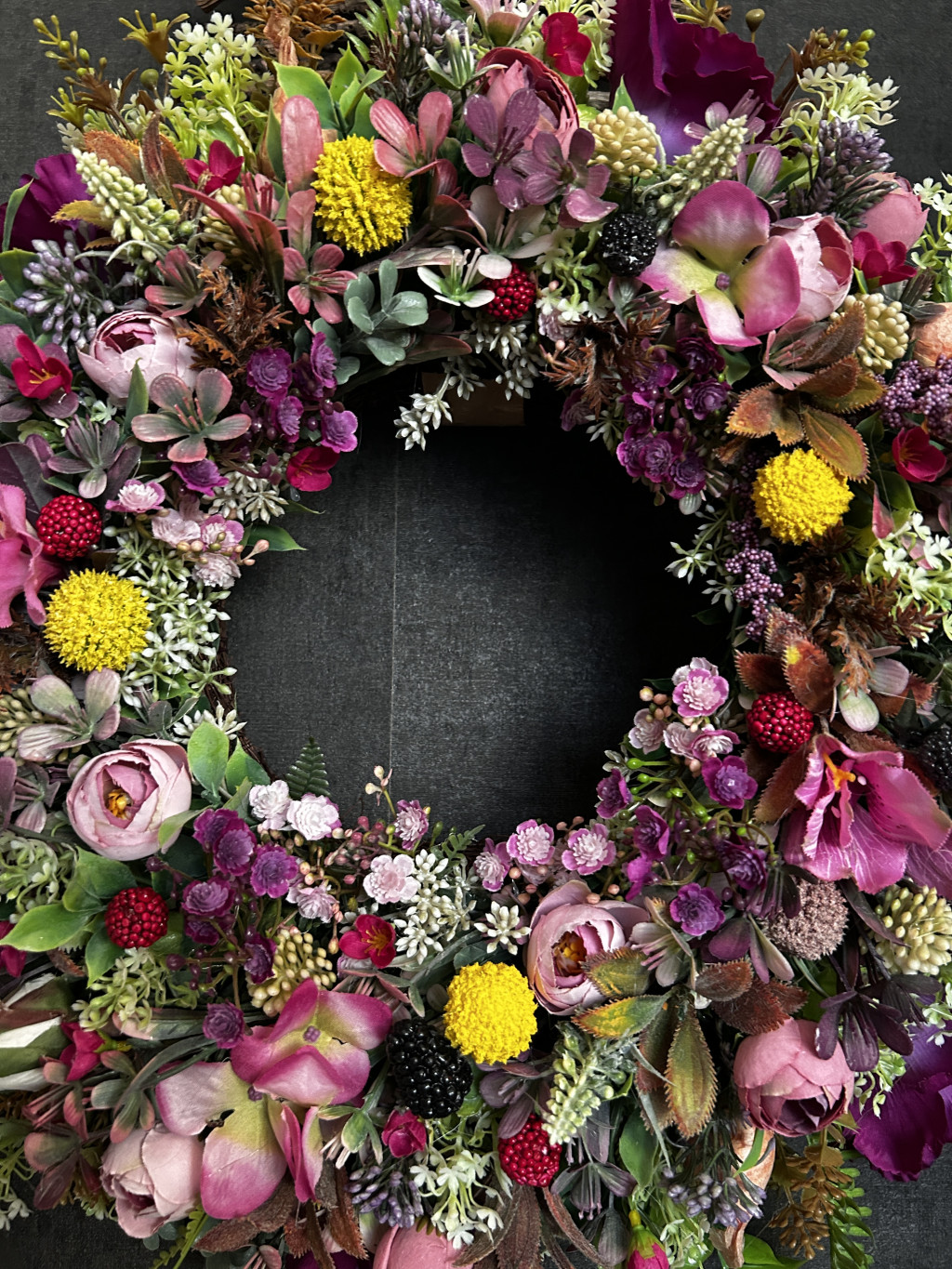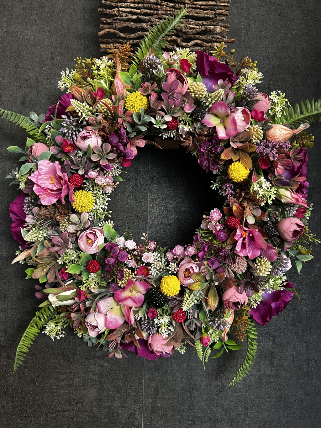 Exkluzív magenta hortenziával, lila harangvirággal, szederrel, apró virágokkal készült ajtókopogtató.