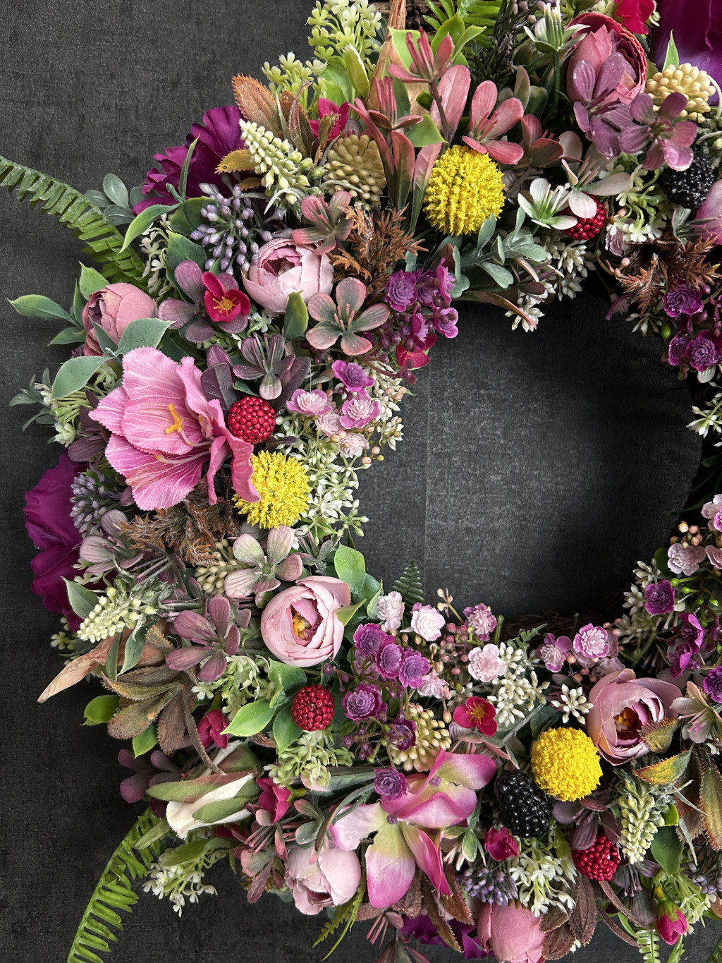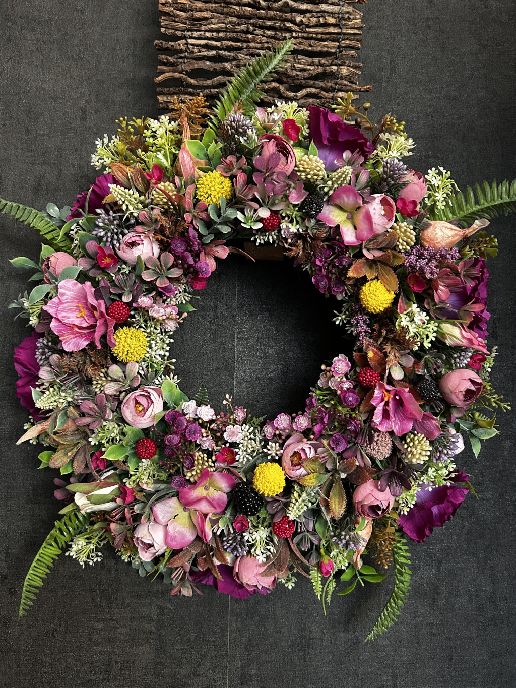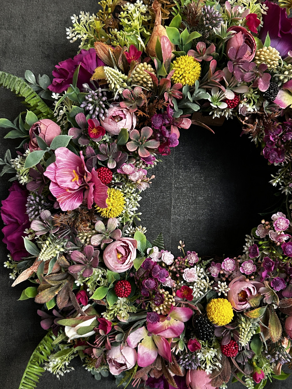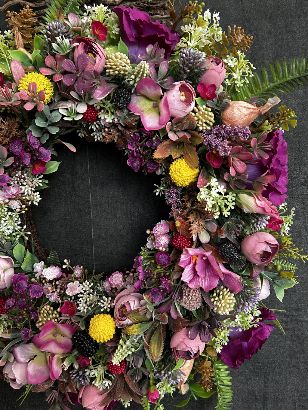 Exkluzív magenta hortenziával, lila harangvirággal, szederrel, apró virágokkal készült ajtókopogtató.