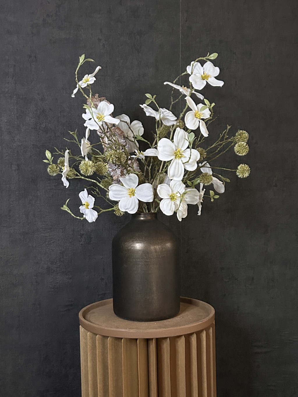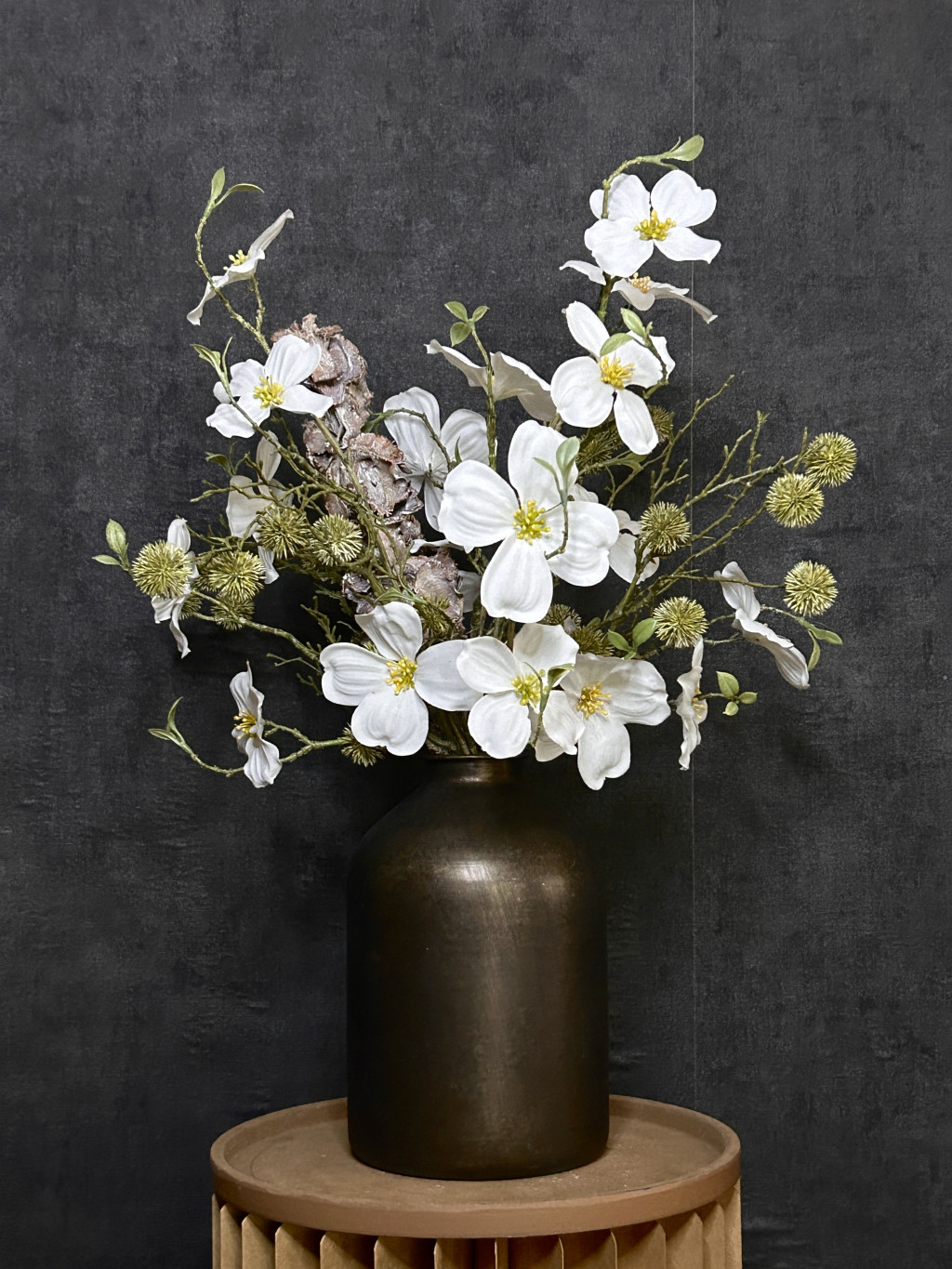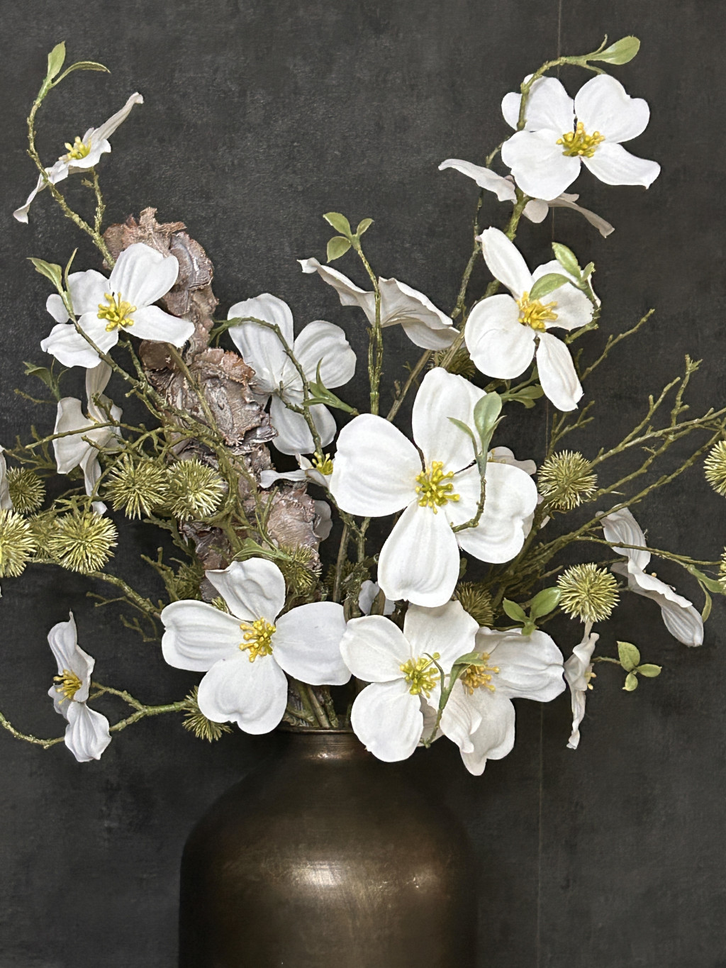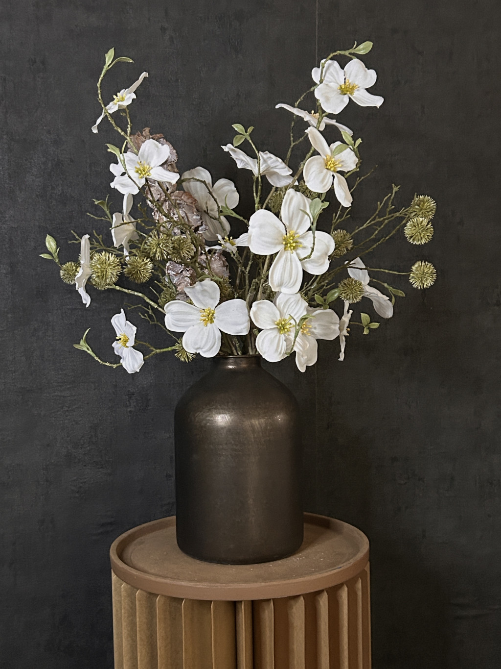 Ez a 22 cm magas, stílusos fekete metál váza letisztult megjelenésével és a benne elhelyezett fehér mangólia selyemvirágokkal,zöld bogáncs zöldekkel tökéletes választás, ha időtálló, mégis természetközeli dekorációt szeretnél. A selyemvirágok élethű kidolgozása minden enteriőrt különlegessé tesz – évszaktól függetlenül is