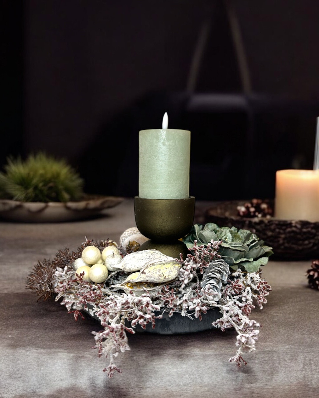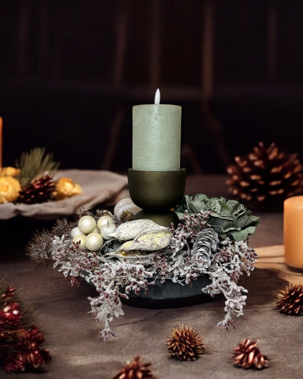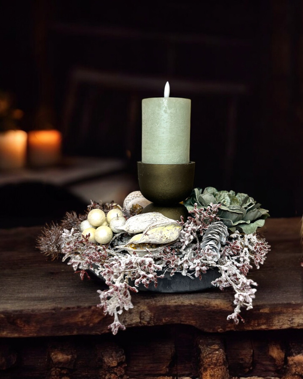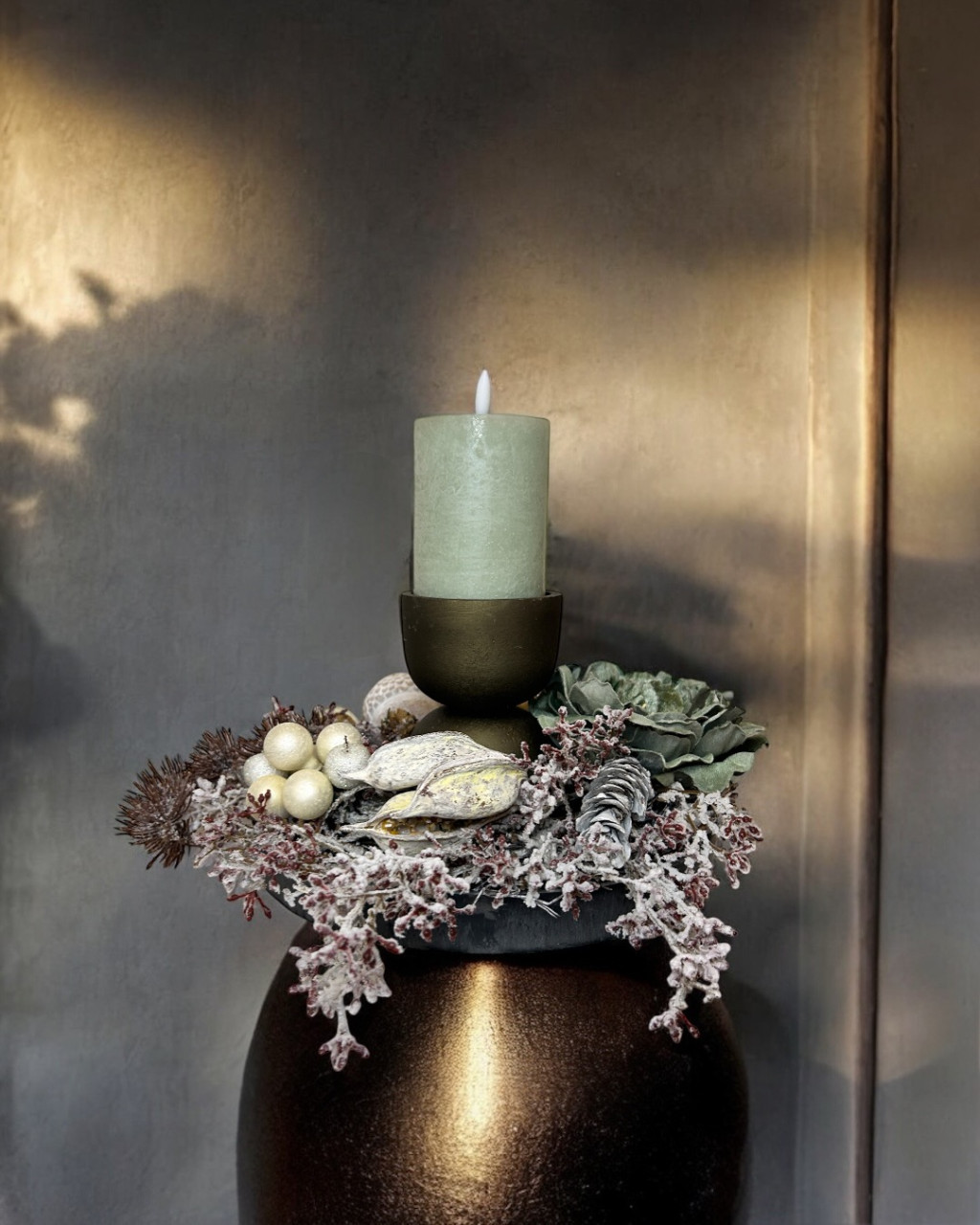 Ez a stílusos kompozíció egy zöld led gyertyával készült. Letisztult megjelenésével és a gyertya köré elhelyezett termések tökéletes választás, ha időtálló, mégis természetközeli dekorációt szeretnél. Minden enteriőrt különlegessé tesz – évszaktól függetlenül is
