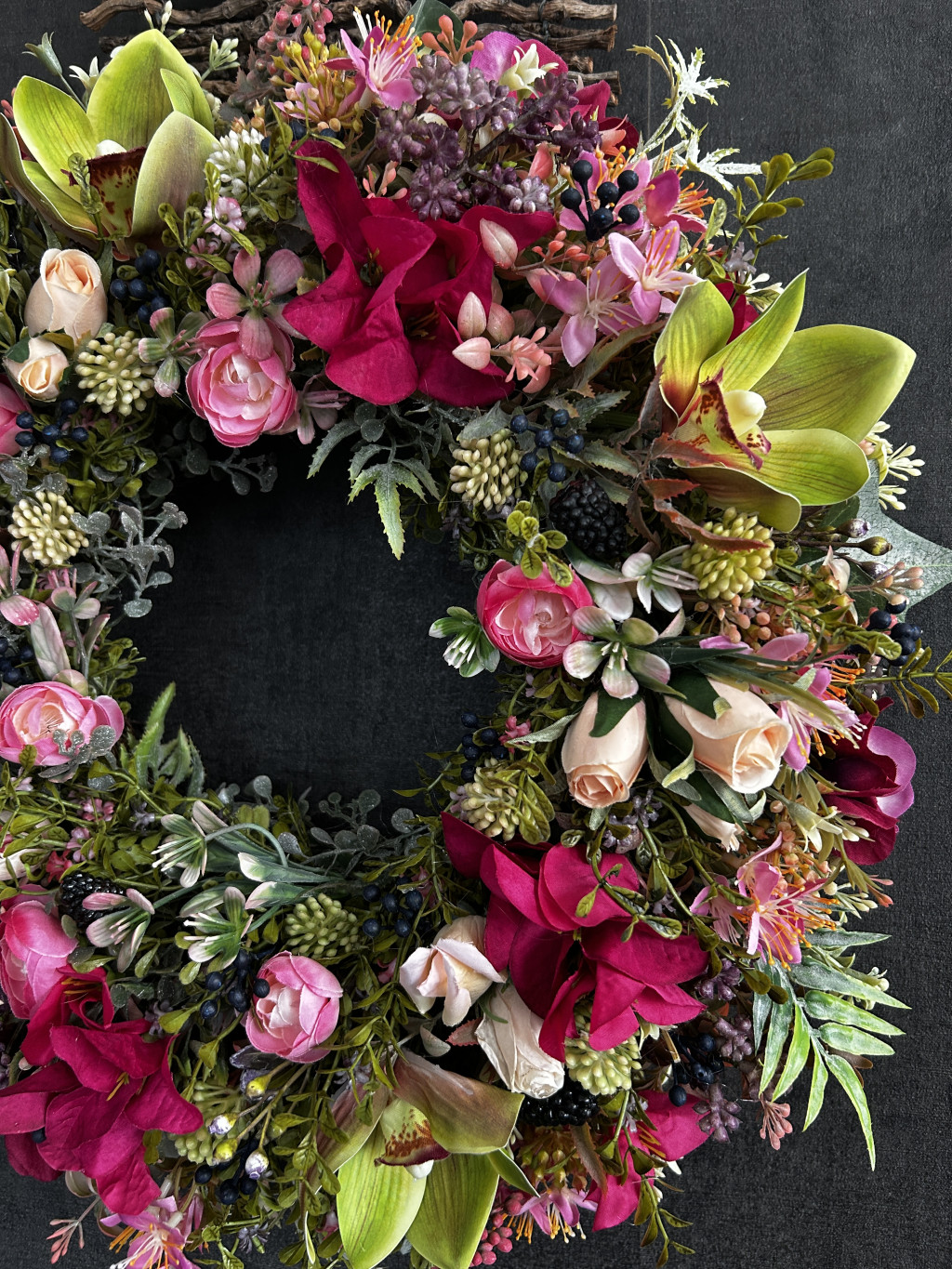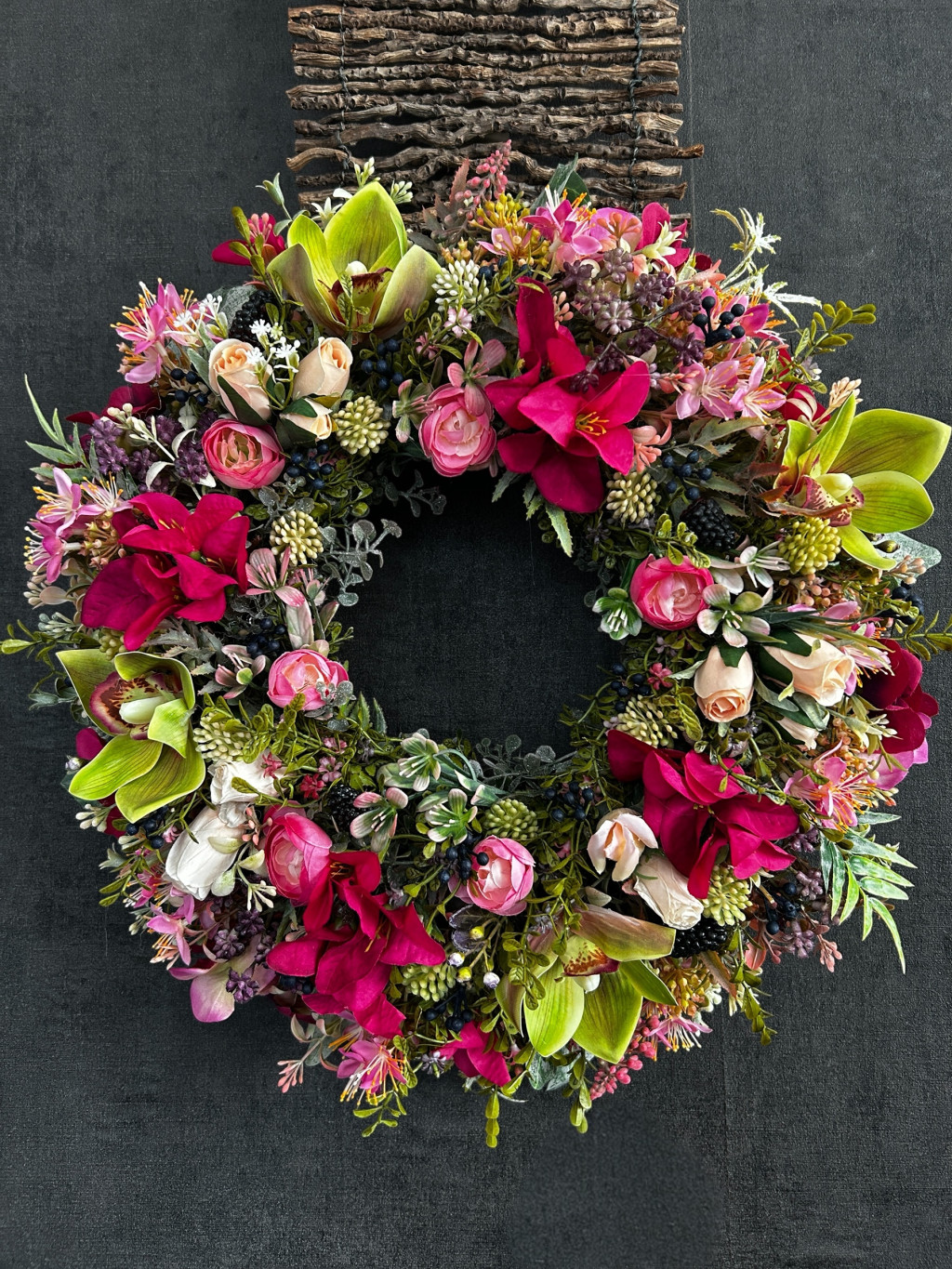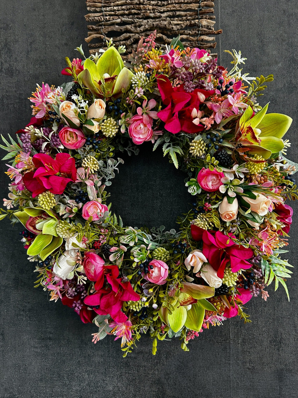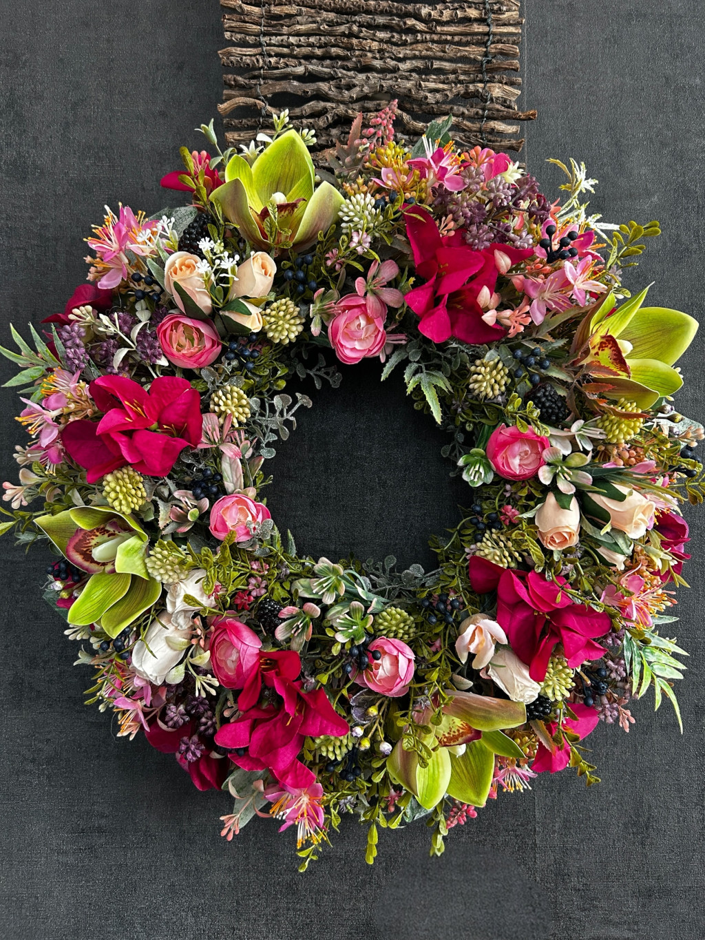 Exkluzív murvafürttel,selyem orhideákkal, szederrel apró virágokkal készült ajtókopogtató.