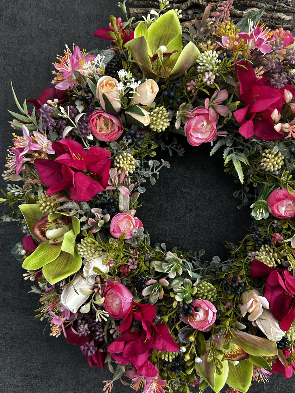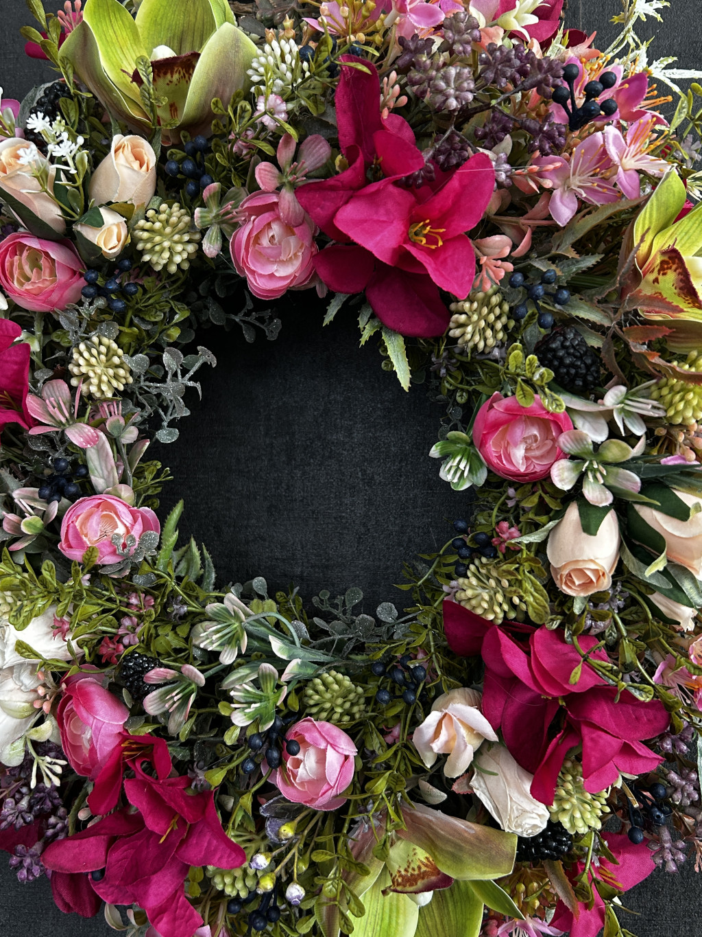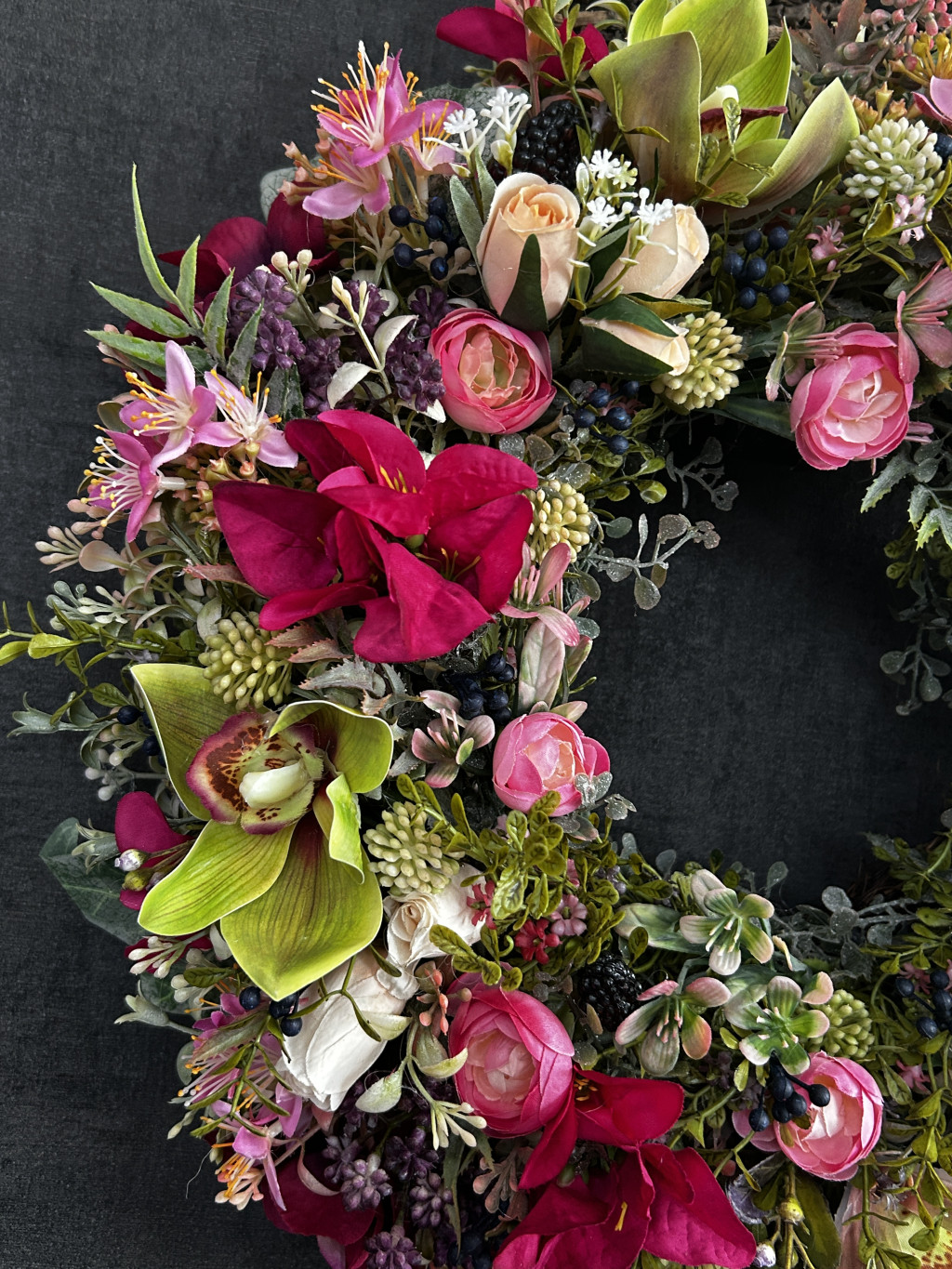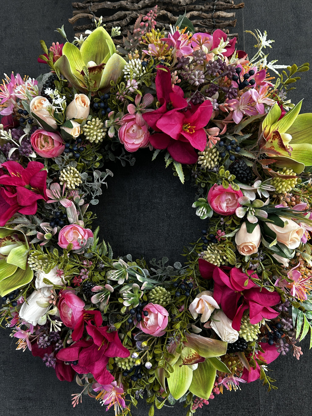 Exkluzív murvafürttel,selyem orhideákkal, szederrel apró virágokkal készült ajtókopogtató.