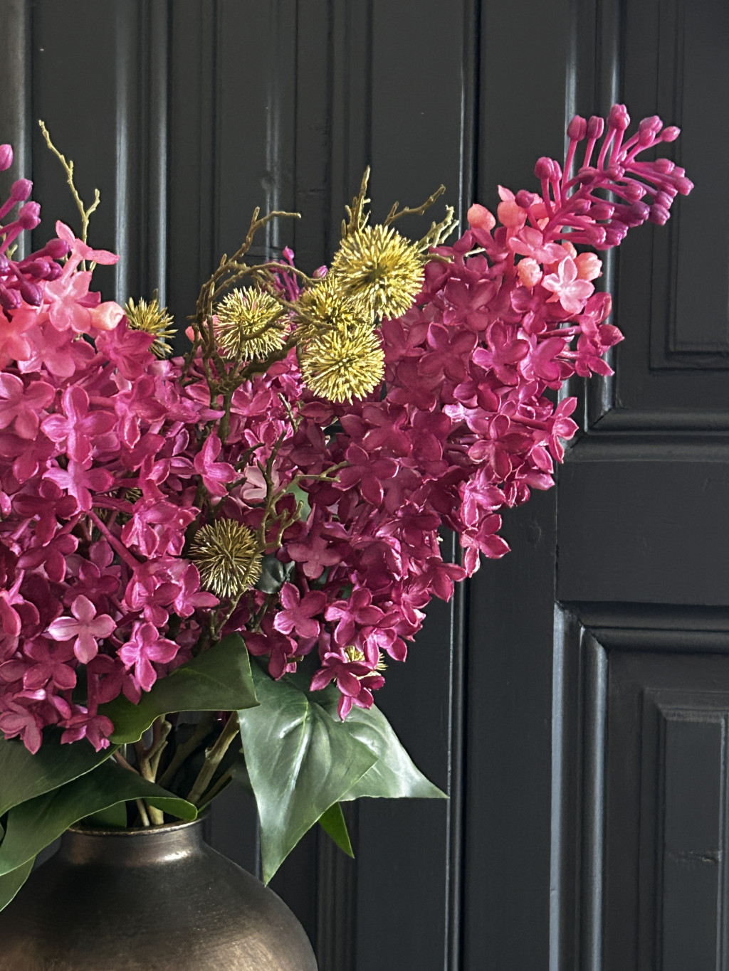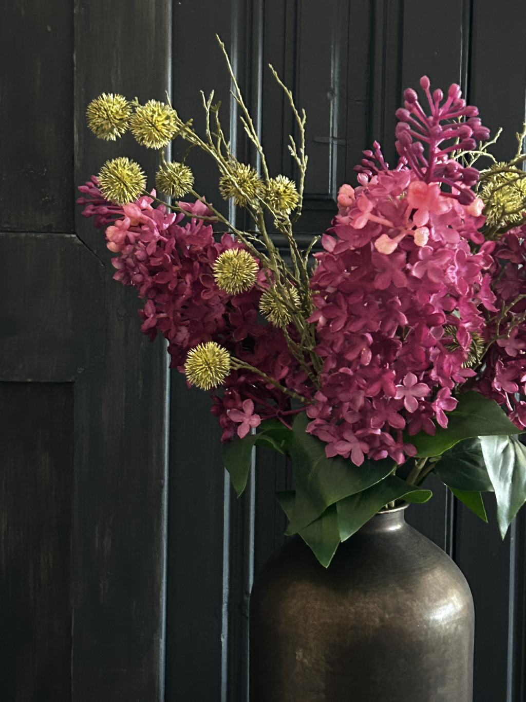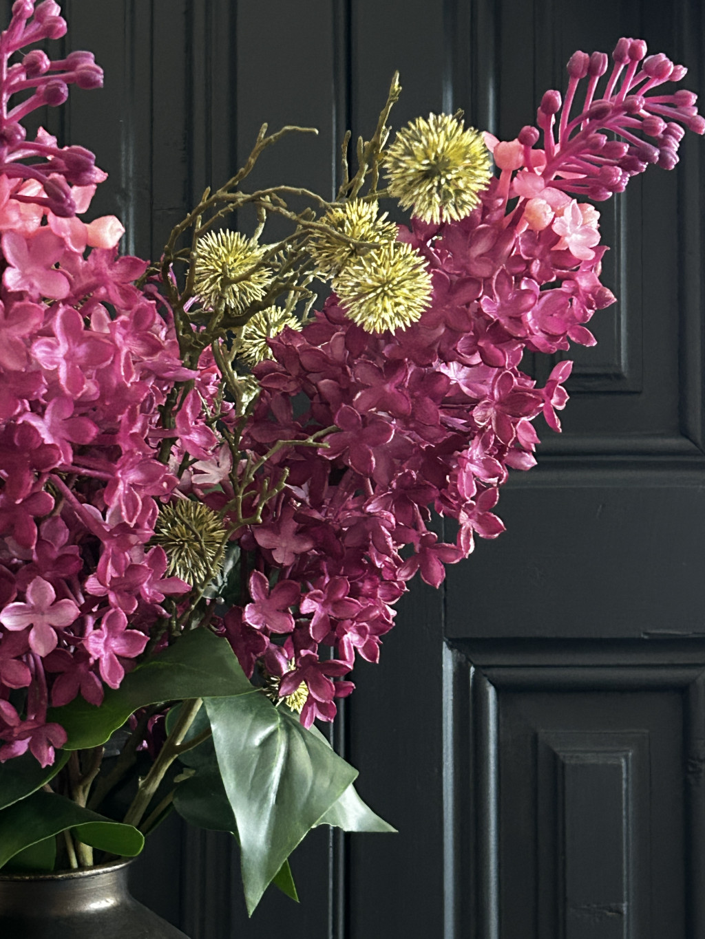 Exkluzív élethű magenta színű orgona virágkompozíció bogáncs ágakkal fém vázában.