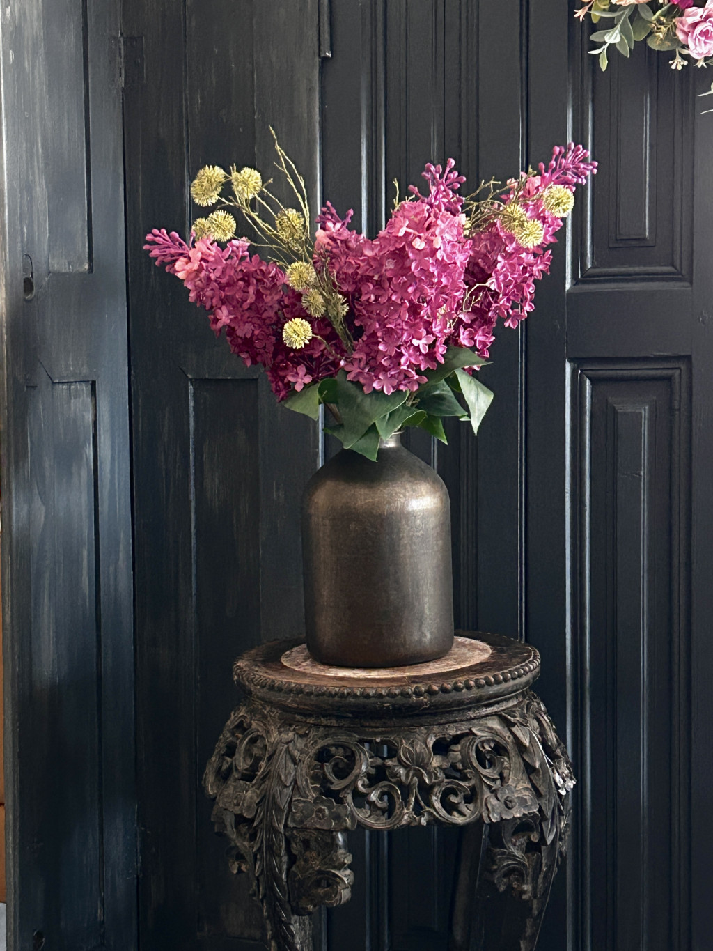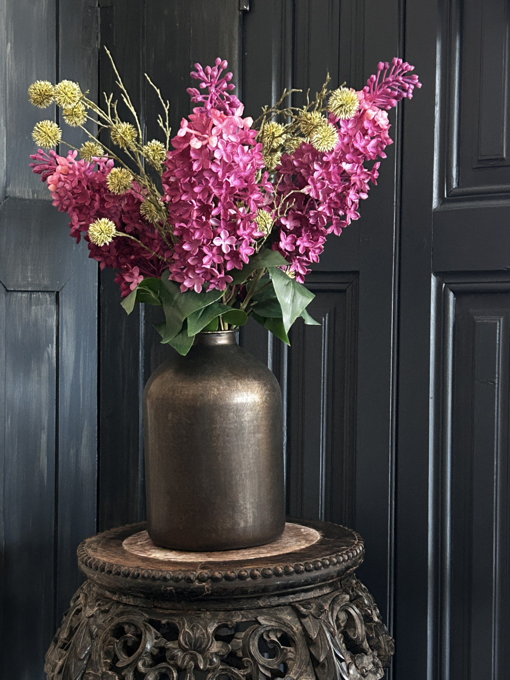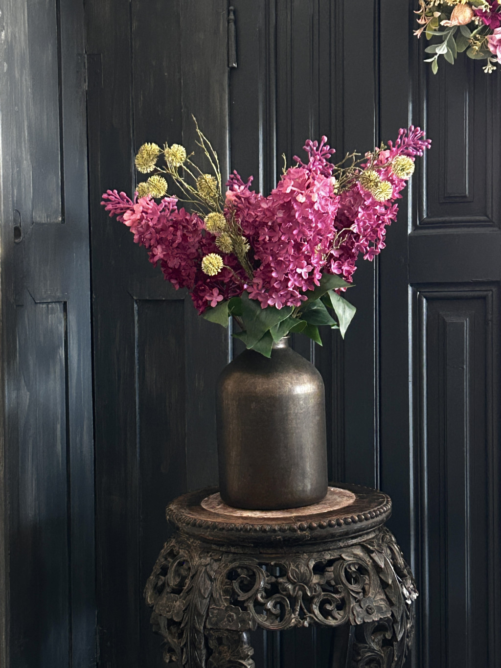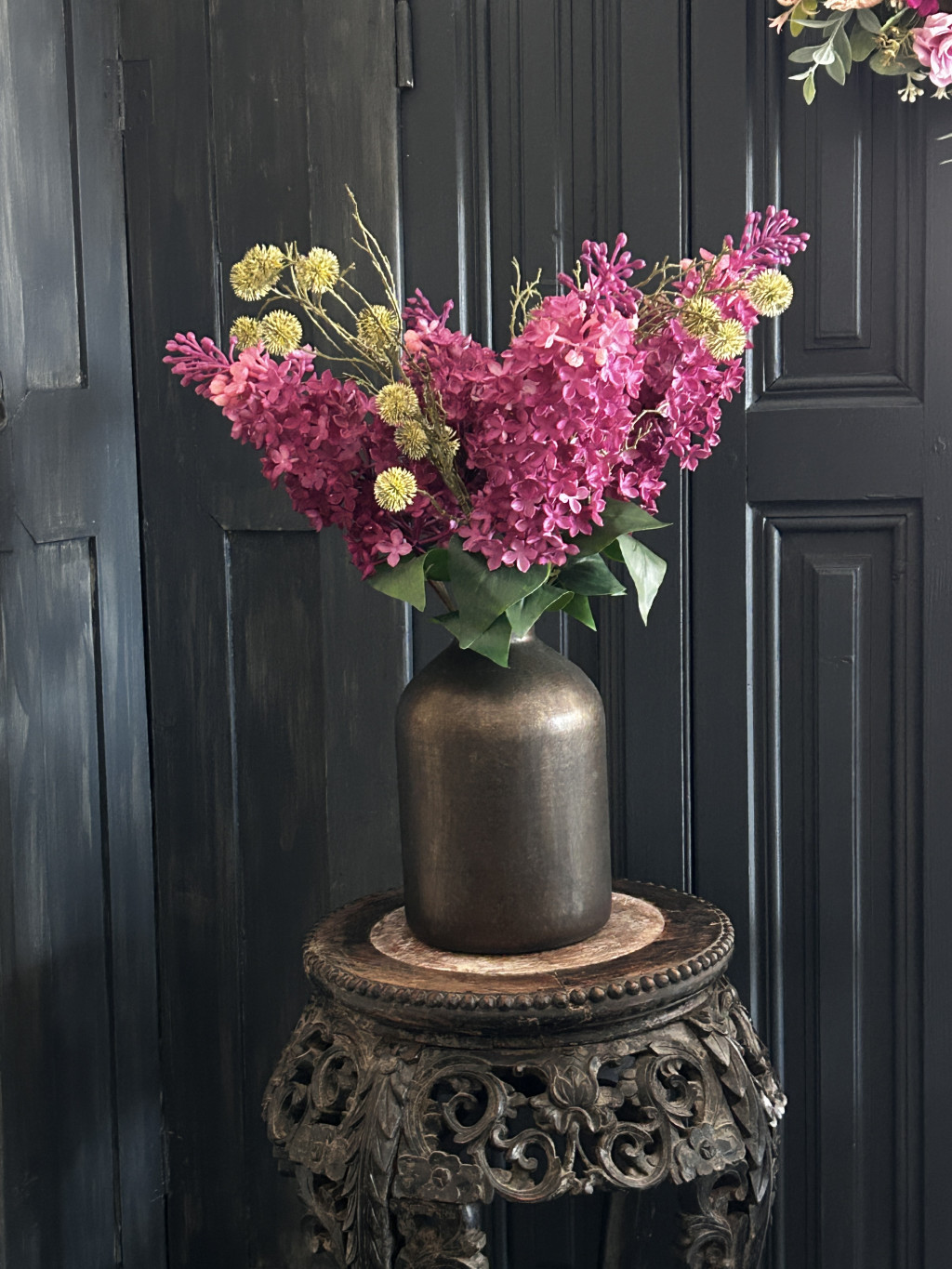 Exkluzív élethű magenta színű orgona virágkompozíció bogáncs ágakkal fém vázában.
