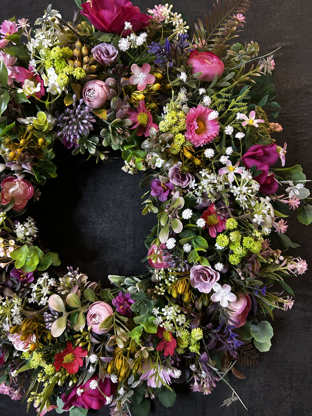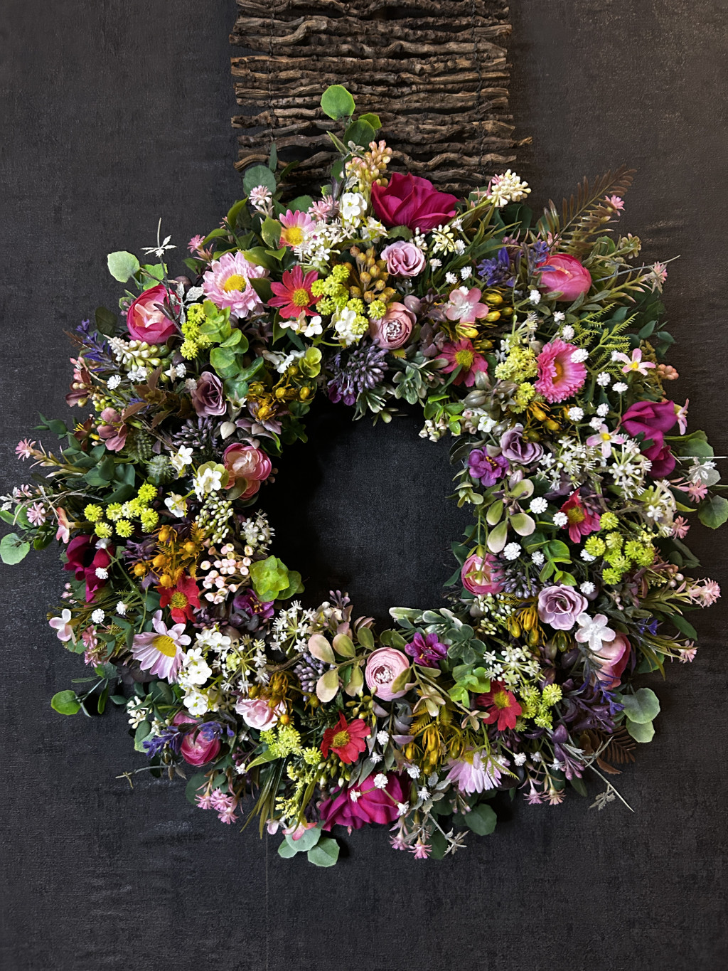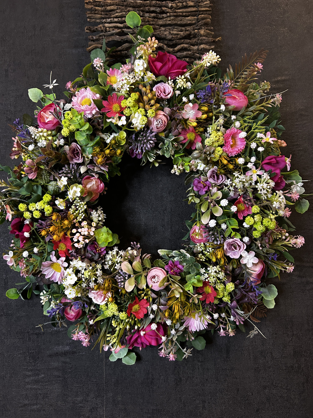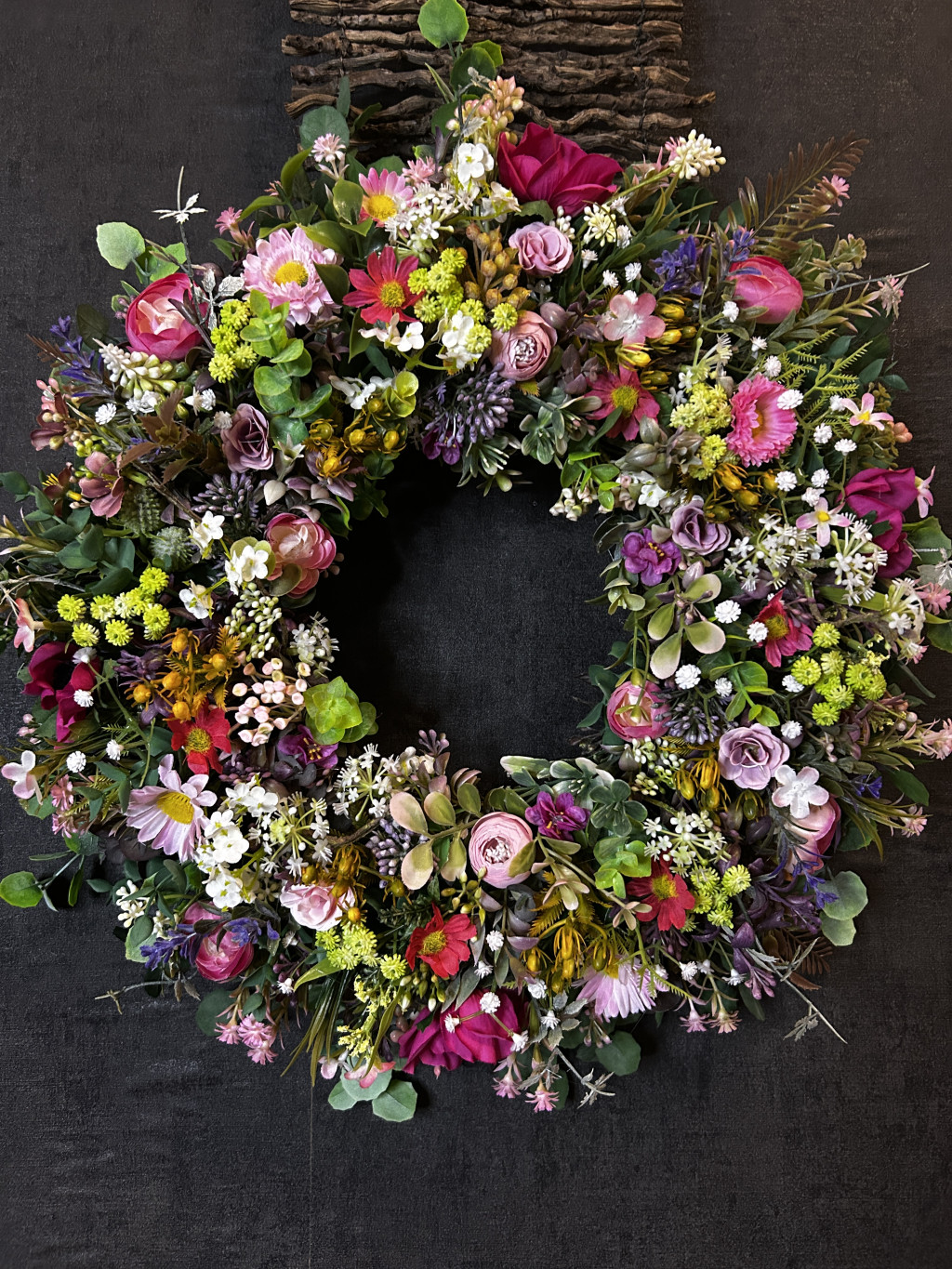 Exkluzív réti virágokkal, apró virágokkal készült ajtókopogtató.