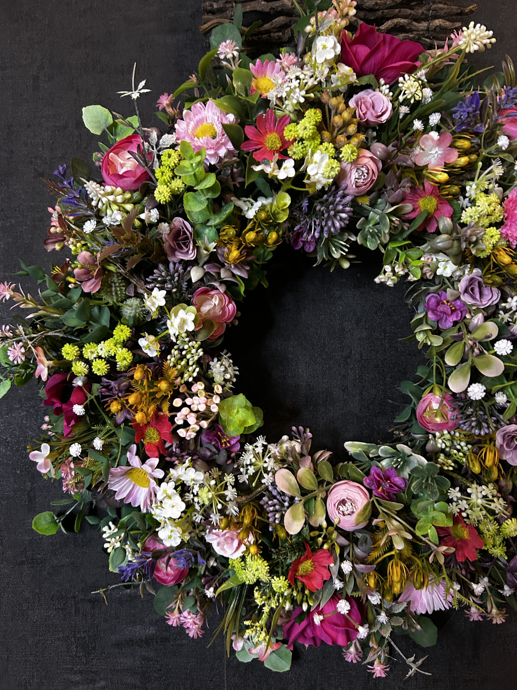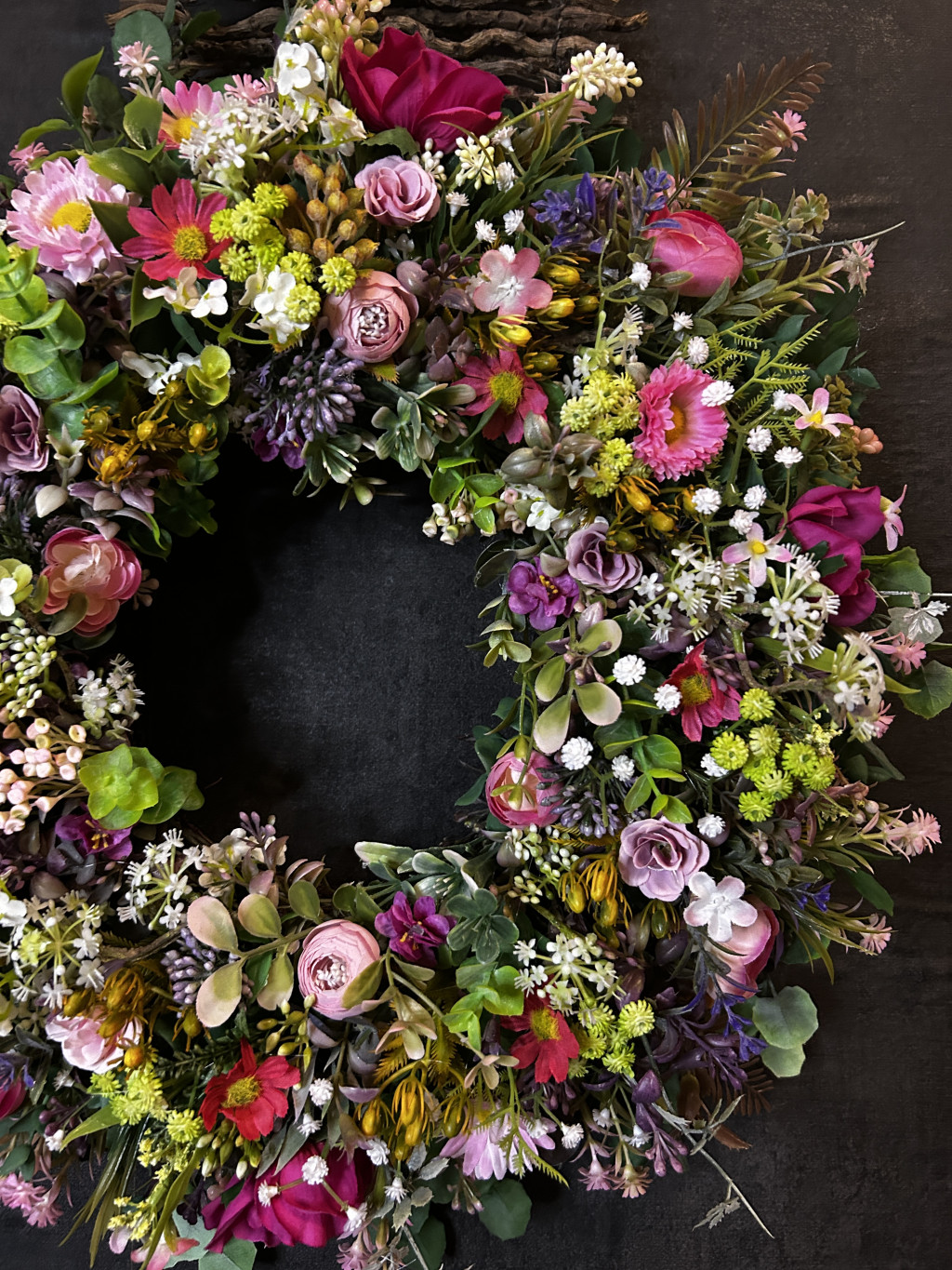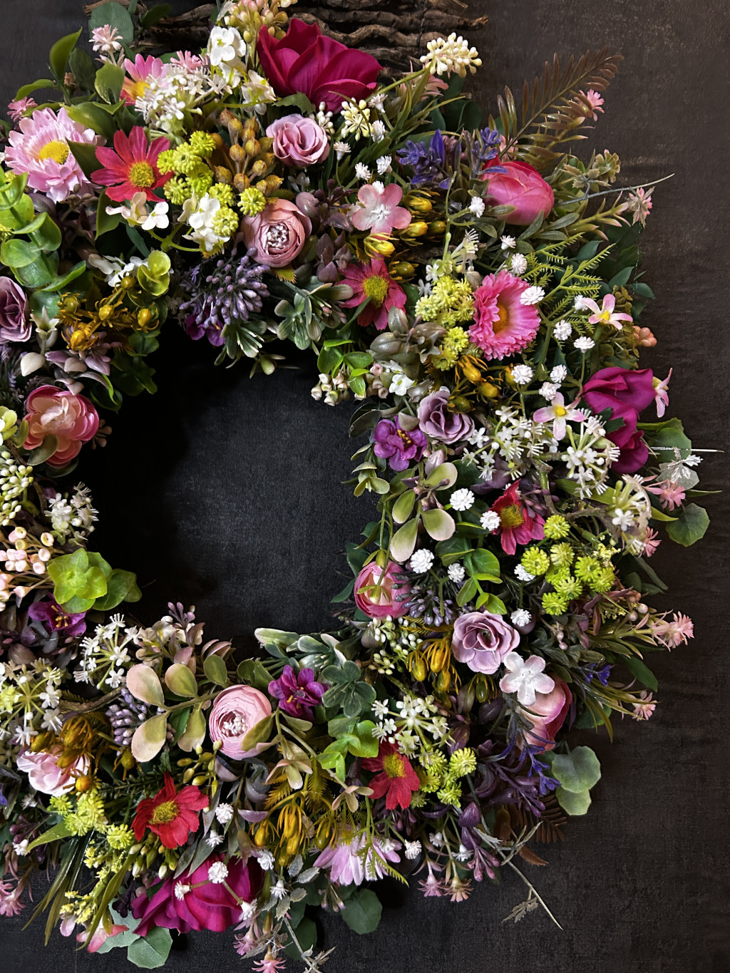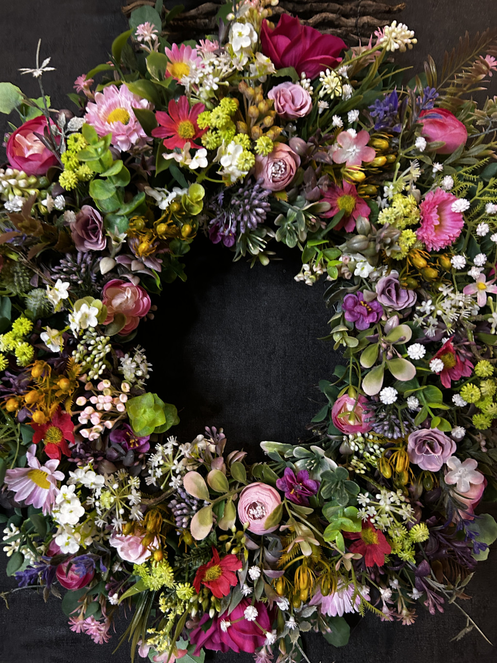 Exkluzív réti virágokkal, apró virágokkal készült ajtókopogtató.