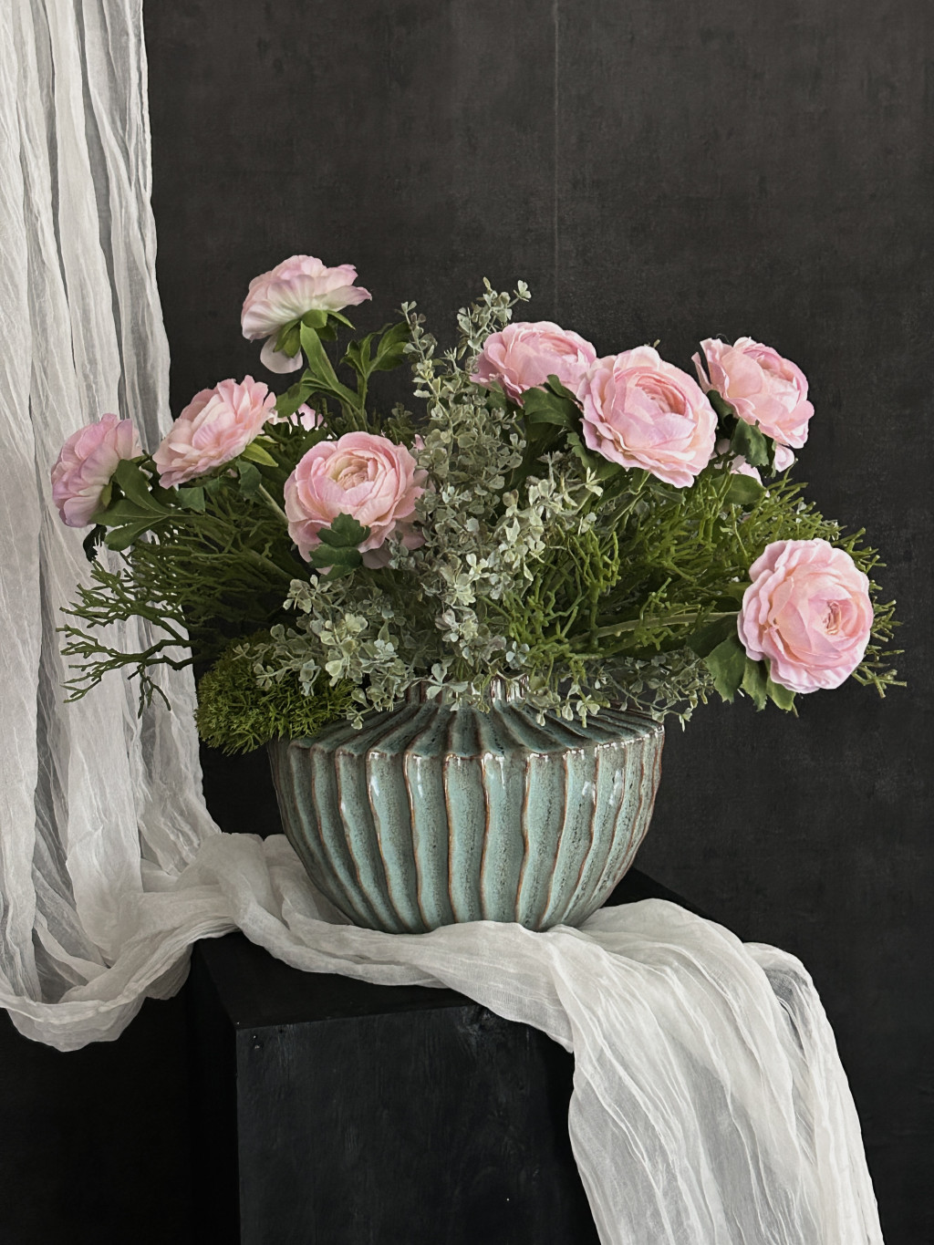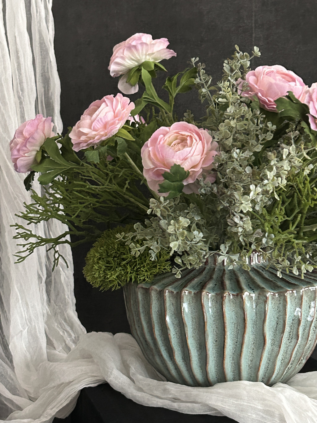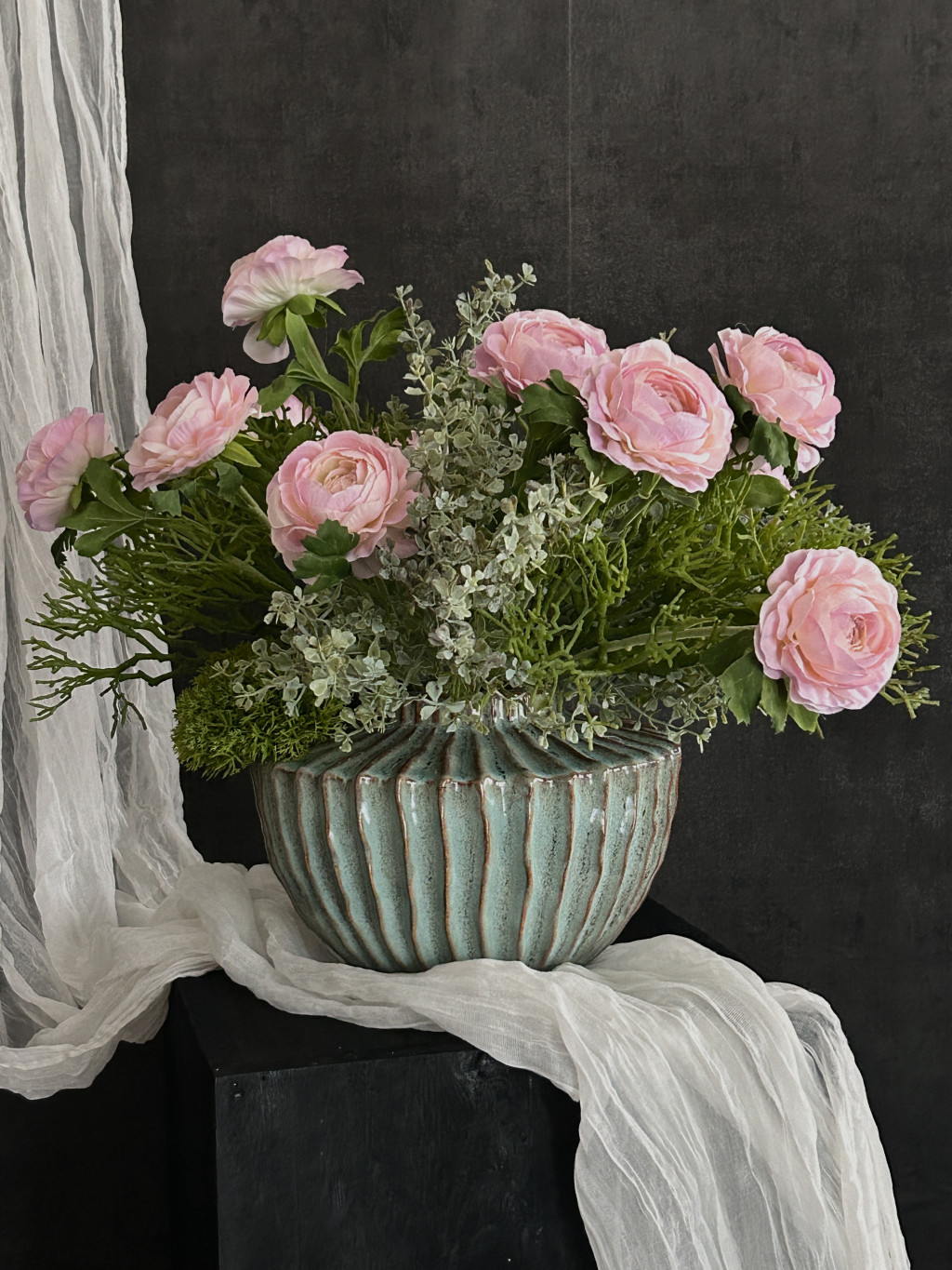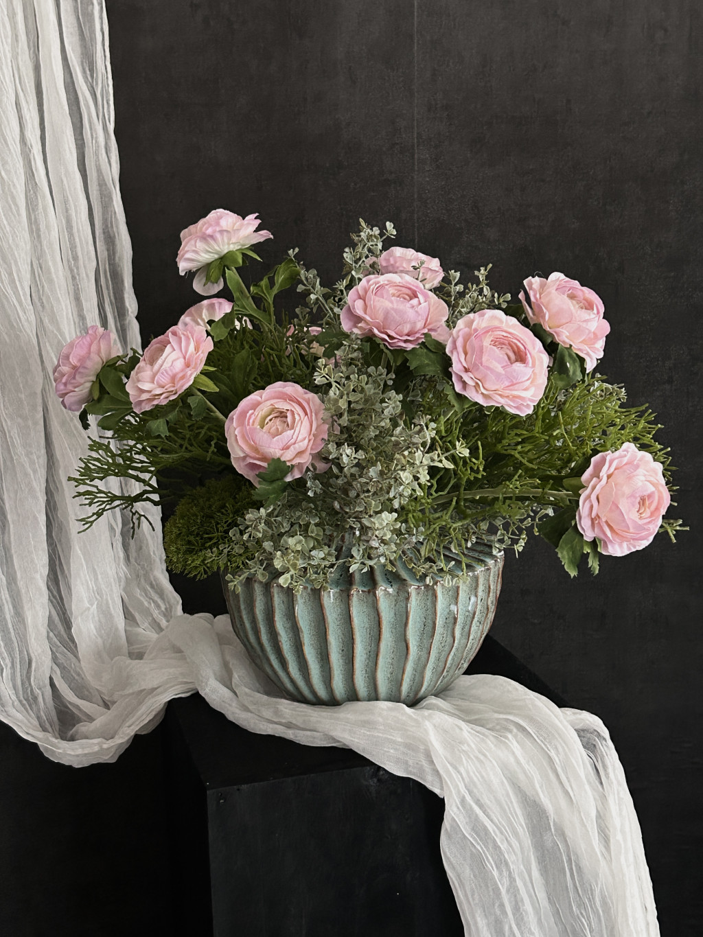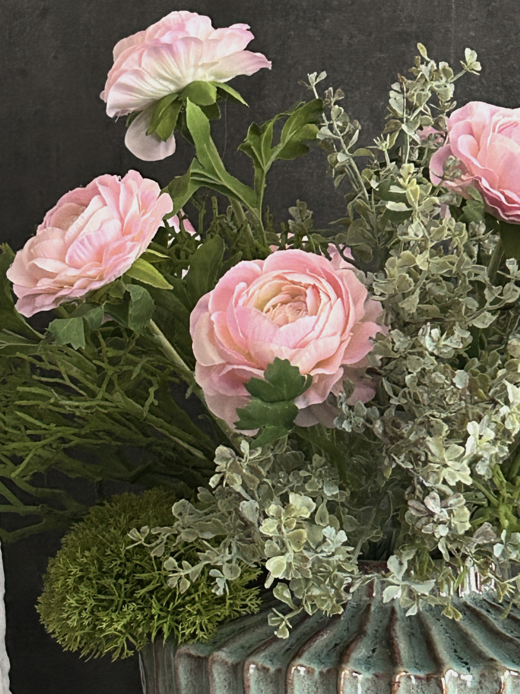 Exkluzív pasztell rózsaszín csodás boglárka virágkompozíció korall ágakkal,mohával egy türkiz kerámia vázában.