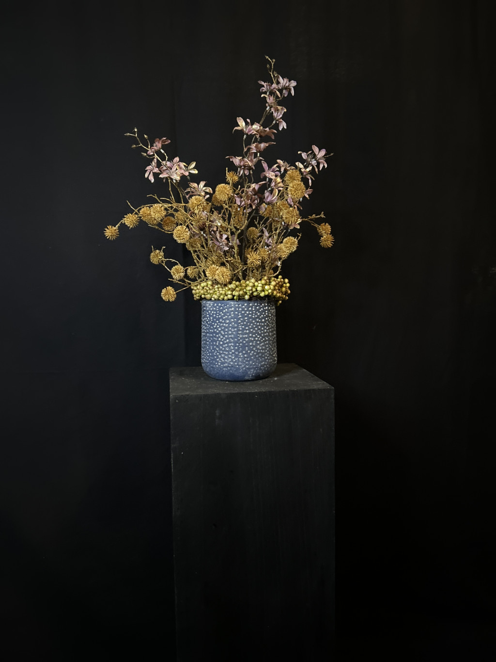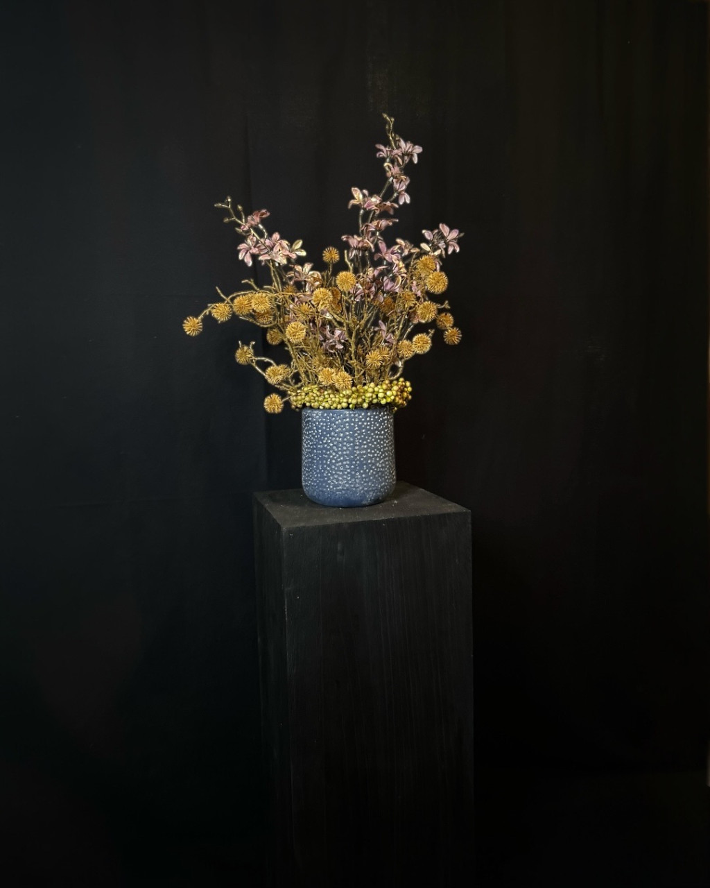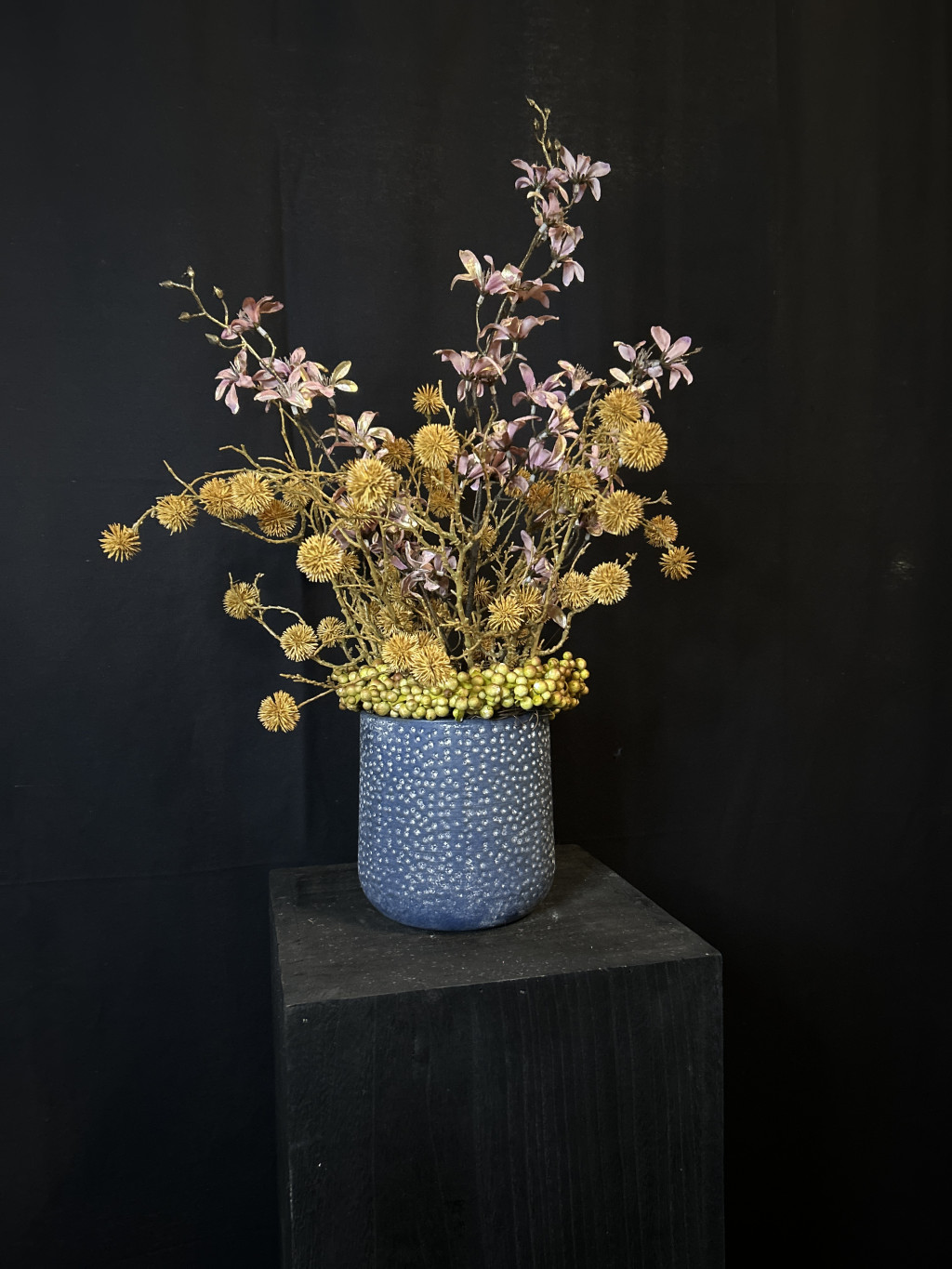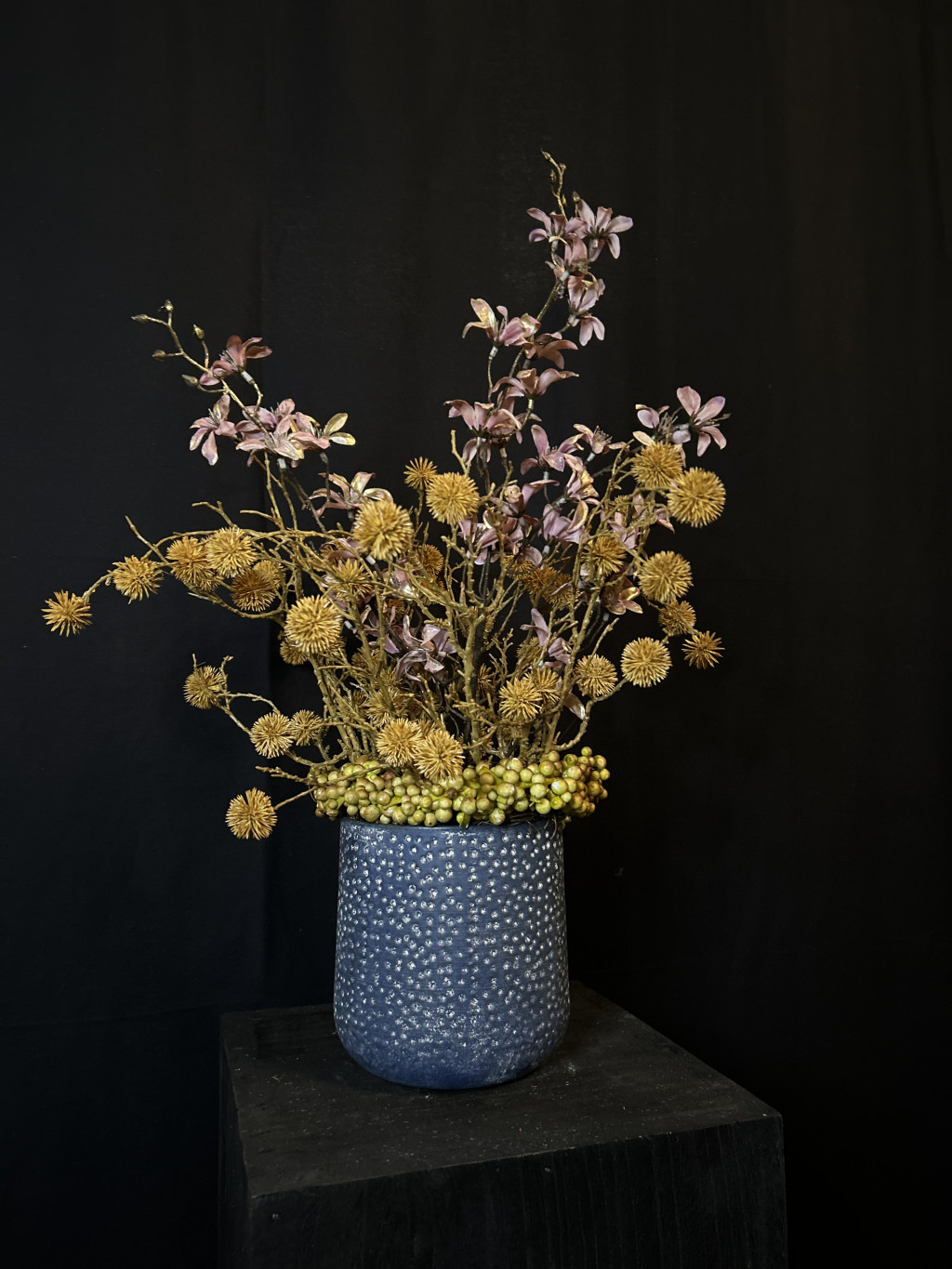 Exkluzív fém kék kaspóban pasztell rózsaszín orchidea okkersárga bogáncs ágakkal készült kompozíció