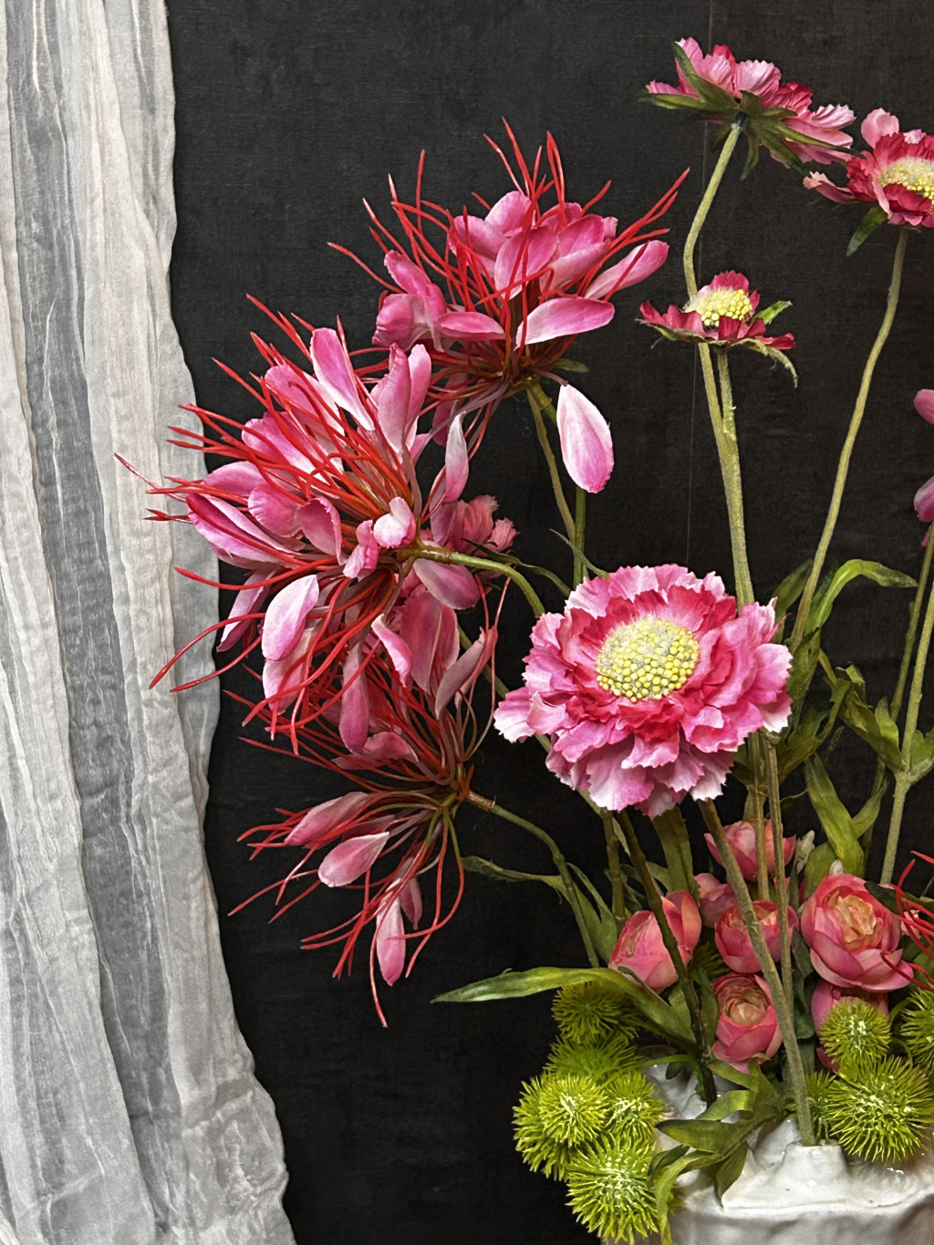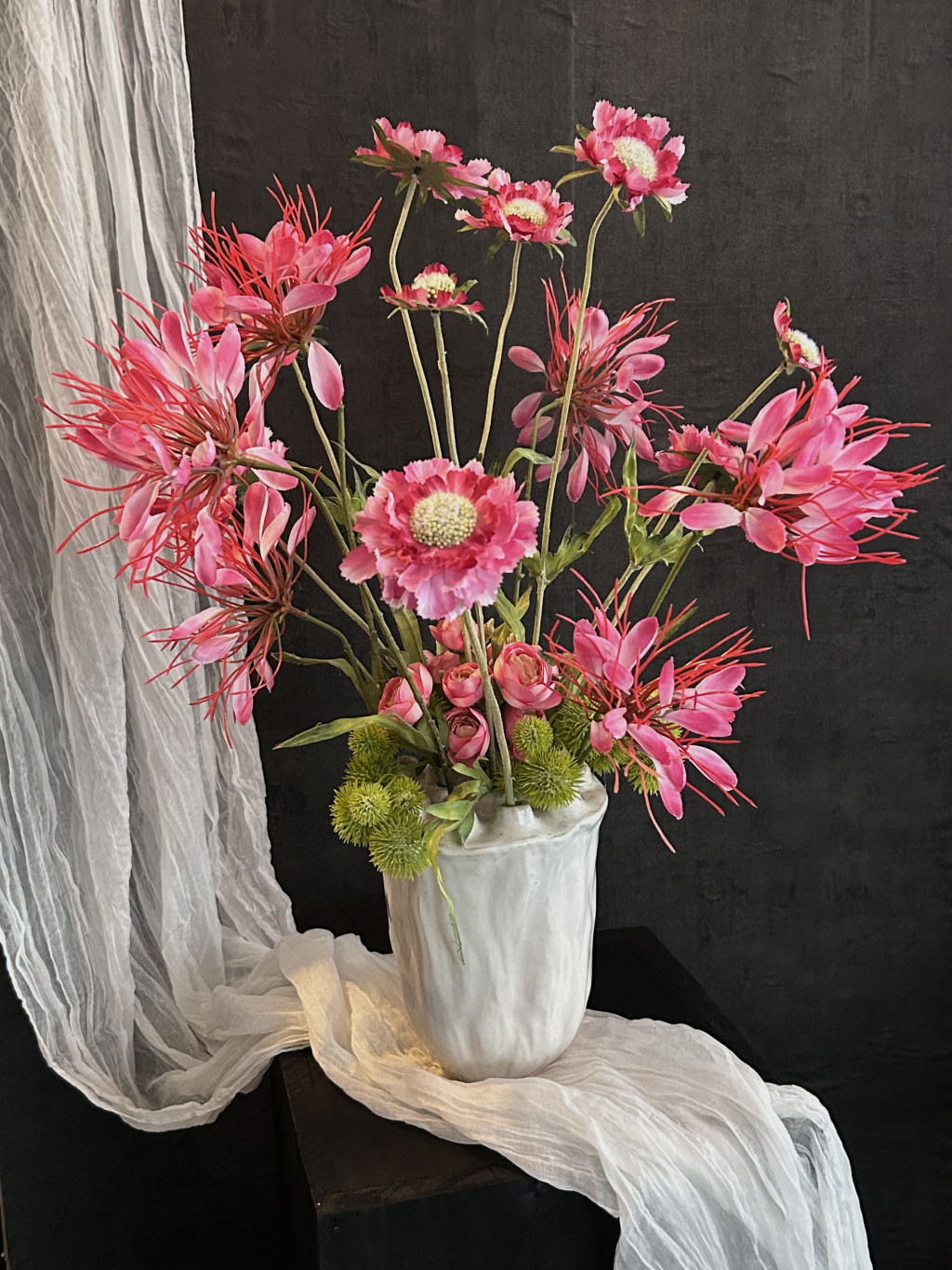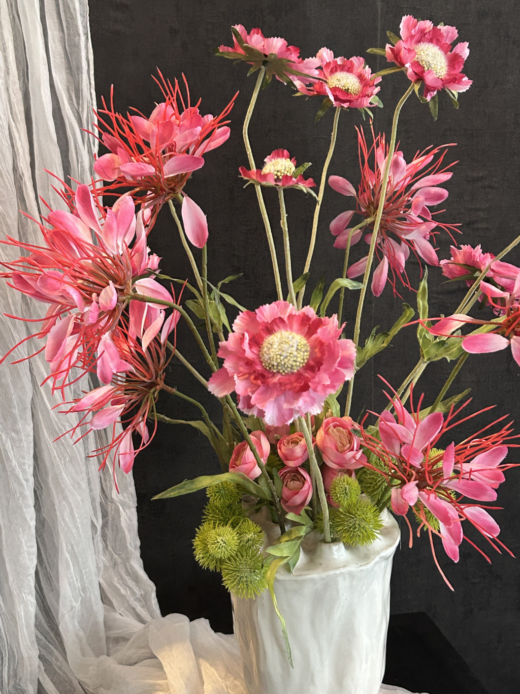 Exkluzív hatalmas magenta színű vad százszorszép selyemvirágokkal készült virágkompozíció és pókvirággal, boglárkákkal, bogáncsokkal egy kerámia fehér, lótusz vázában