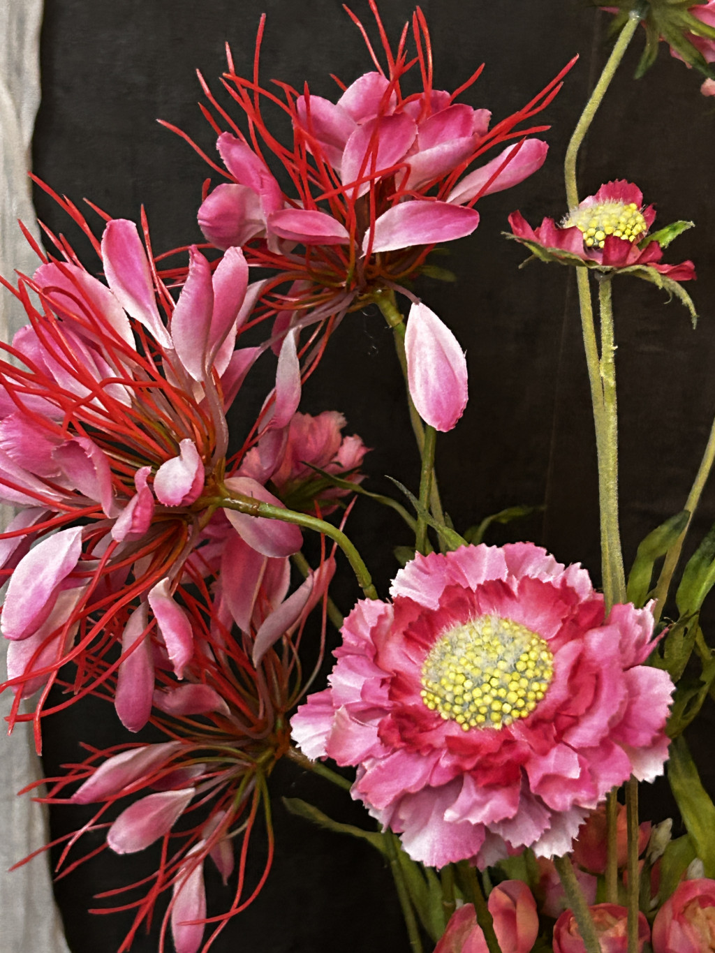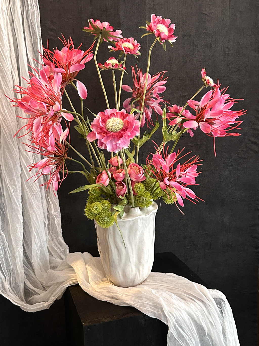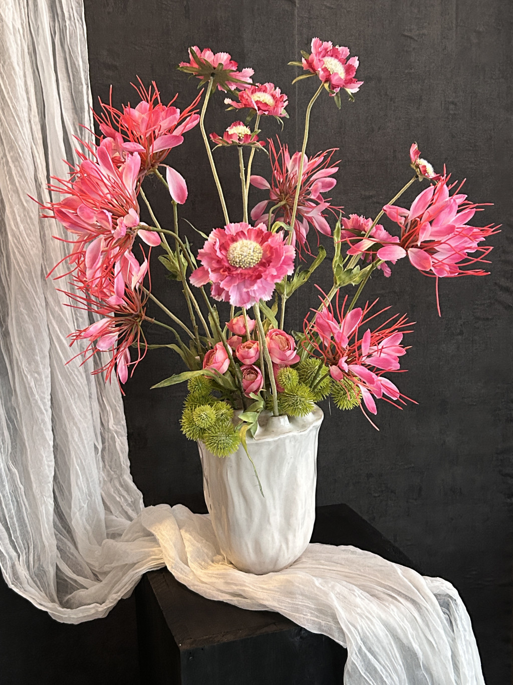 Exkluzív hatalmas magenta színű vad százszorszép selyemvirágokkal készült virágkompozíció és pókvirággal, boglárkákkal, bogáncsokkal egy kerámia fehér, lótusz vázában