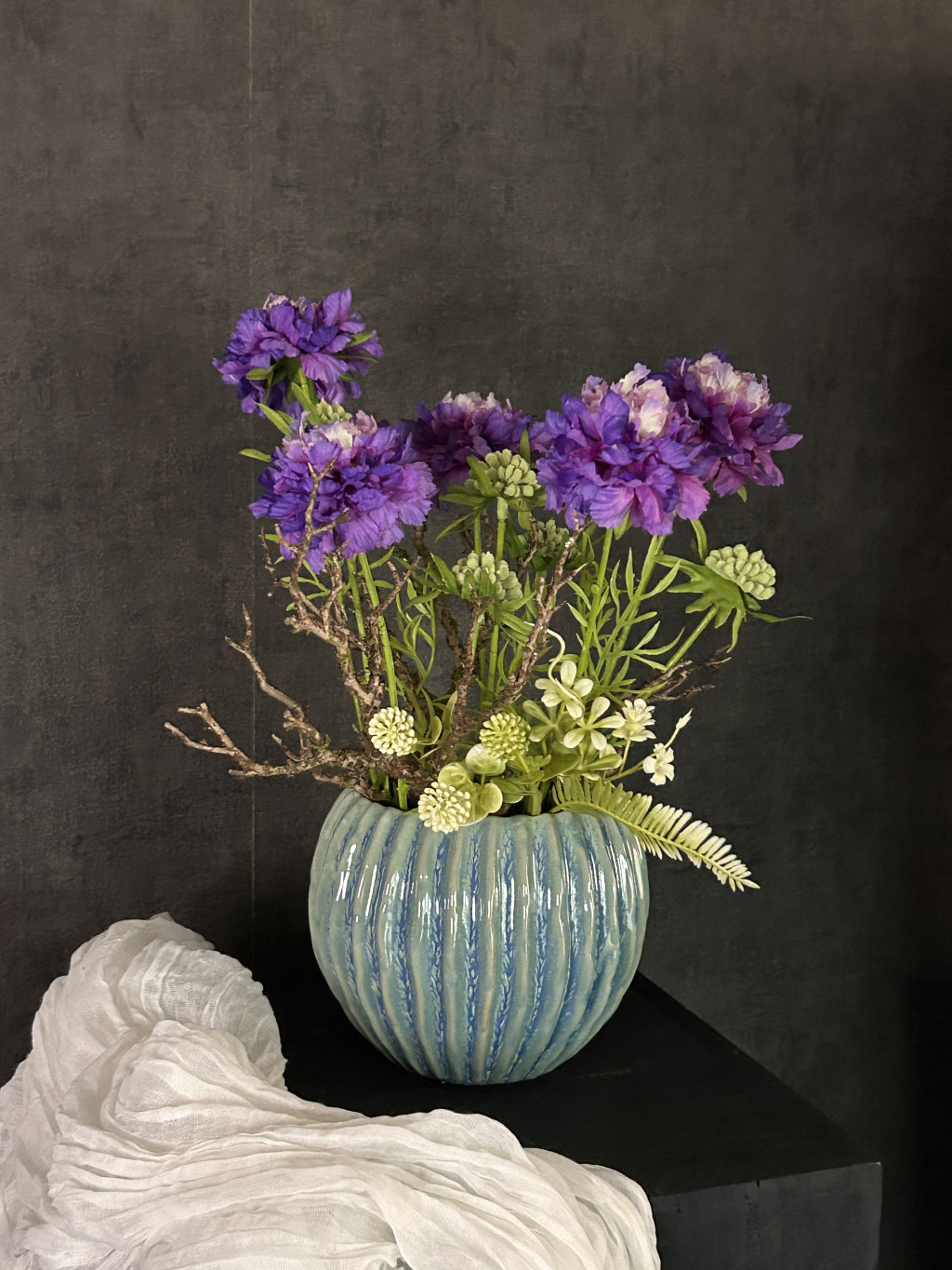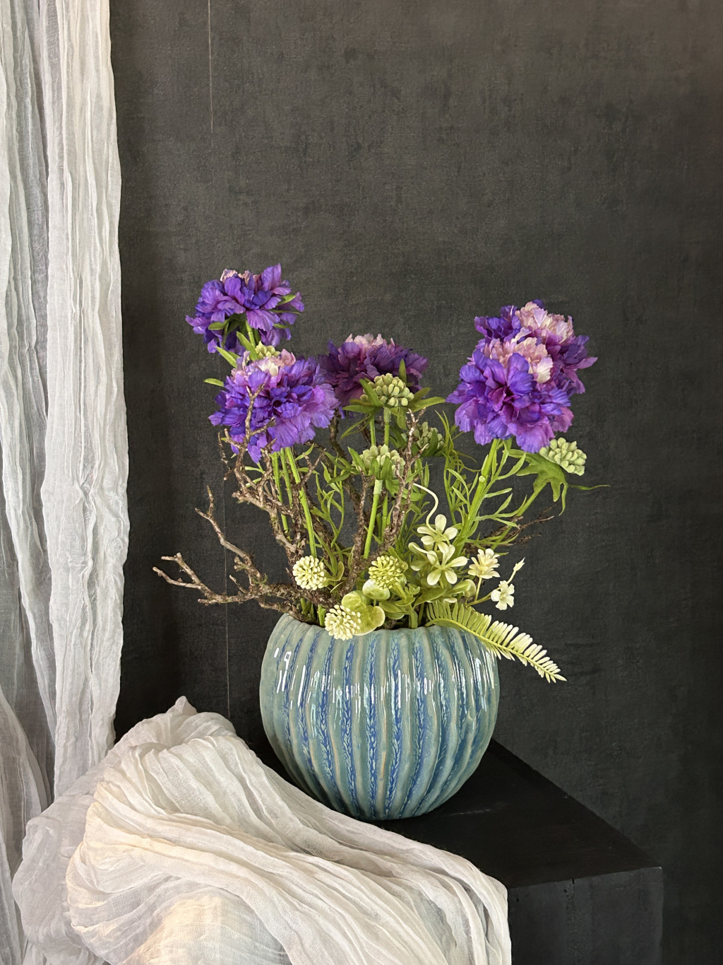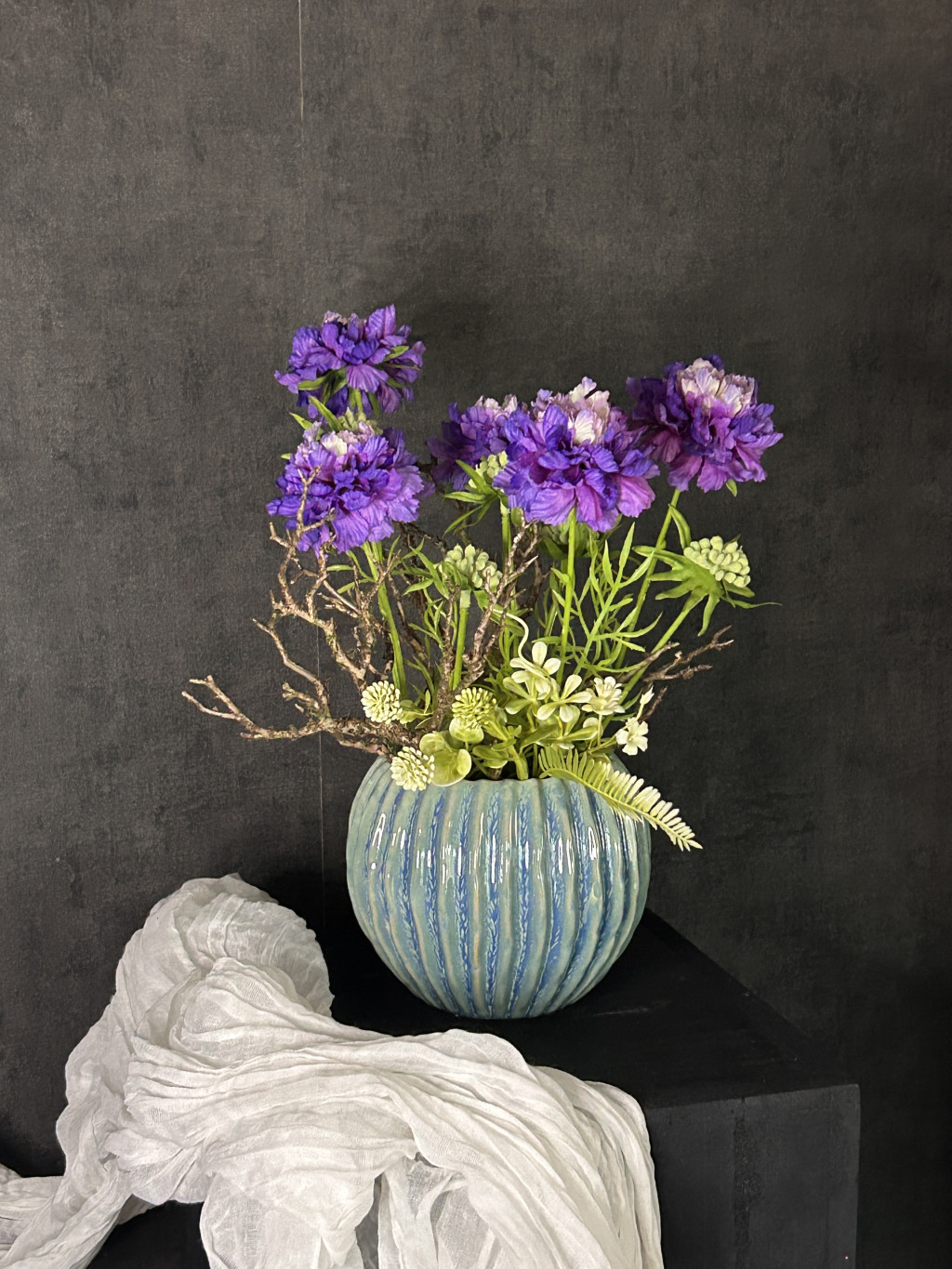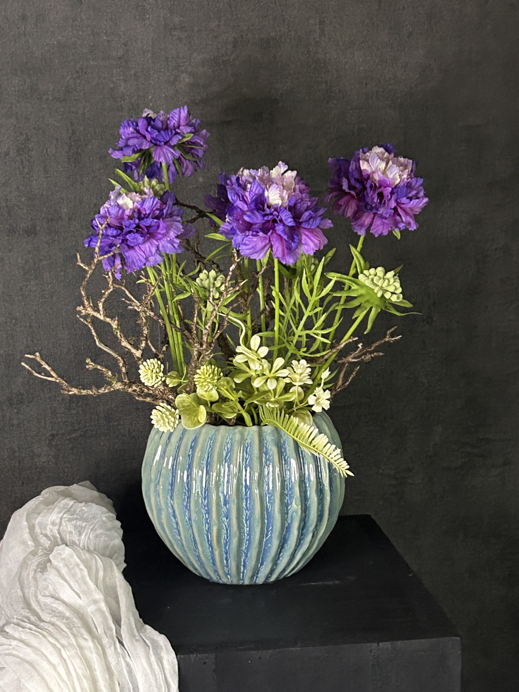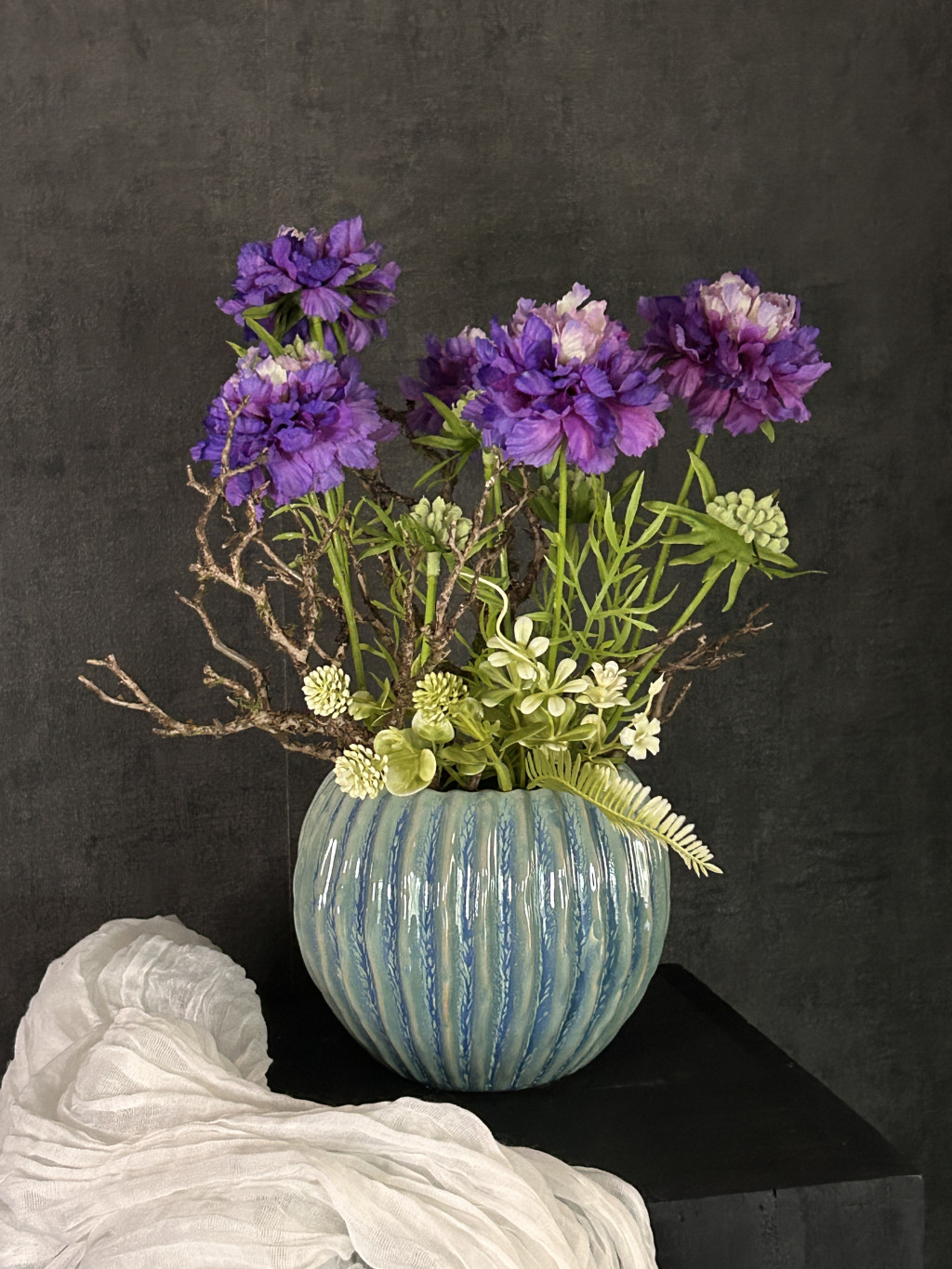 Exkluzív élethű, viola színű scabiosa/ördögszem virágkompozíció türkiz zsinóros kasóban